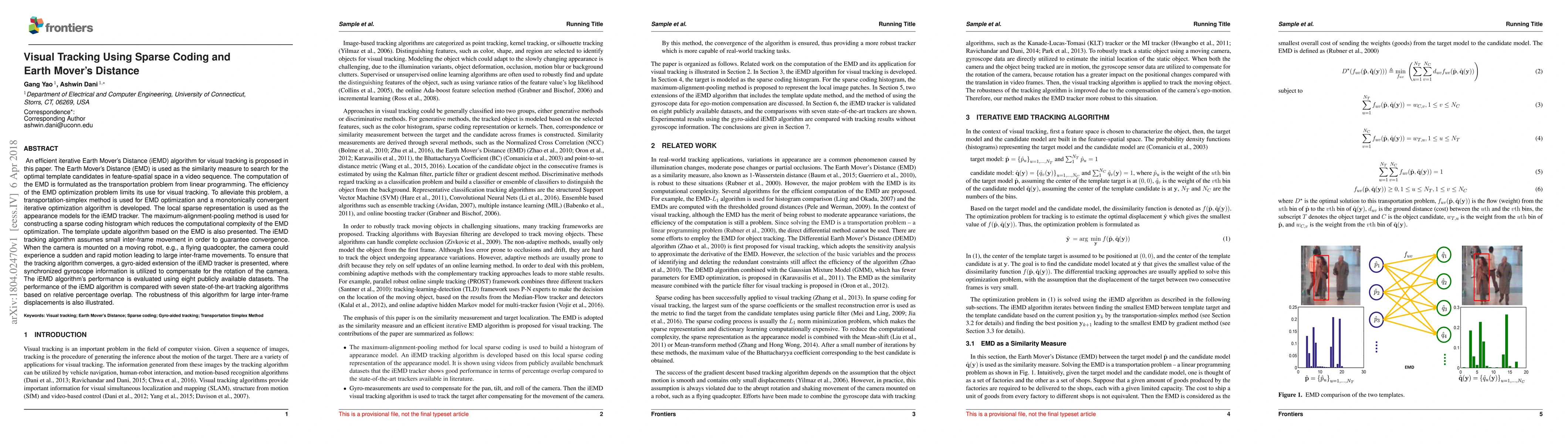 The paper introduces an iterative Earth Mover's Distance (iEMD) algorithm for visual tracking, combining sparse coding and a transportation-simplex method for efficient EMD optimization, along with a gyro-aided extension for handling rapid camera motion.