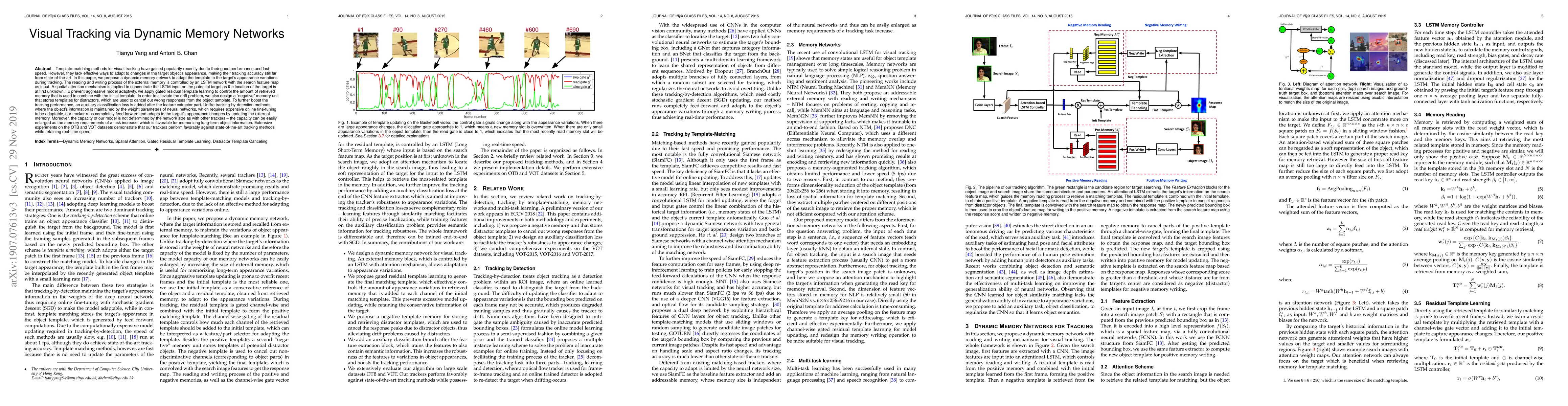 This paper proposes a dynamic memory network for visual tracking that adapts to appearance changes using an LSTM-controlled memory update mechanism and spatial attention. It employs gated residual learning and a "negative" memory unit to mitigate drift, achieving competitive performance against state-of-the-art methods while maintaining real-time speed.
