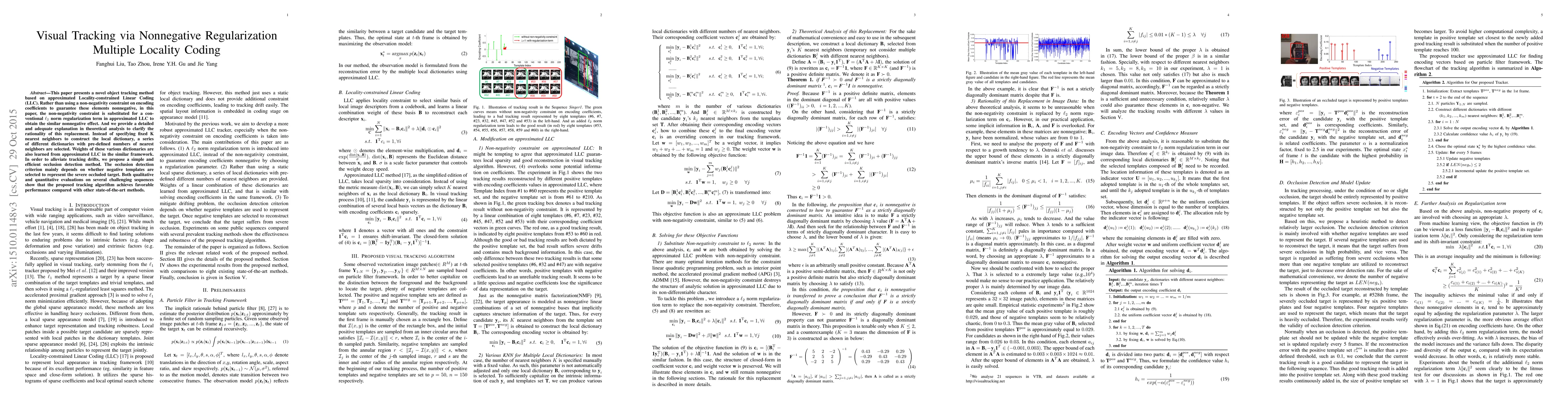 This paper presents a novel object tracking method based on approximated Locality-constrained Linear Coding (LLC). Rather than using a non-negativity constraint on encoding coefficients to guarantee these elements nonnegative, in this paper, the non-negativity constraint is substituted for a conventional $\ell_2$ norm regularization term in approximated LLC to obtain the similar nonnegative effect. And we provide a detailed and adequate explanation in theoretical analysis to clarify the rationality of this replacement. Instead of specifying fixed K nearest neighbors to construct the local dictionary, a series of different dictionaries with pre-defined numbers of nearest neighbors are selected. Weights of these various dictionaries are also learned from approximated LLC in the similar framework. In order to alleviate tracking drifts, we propose a simple and efficient occlusion detection method. The occlusion detection criterion mainly depends on whether negative templates are selected to represent the severe occluded target. Both qualitative and quantitative evaluations on several challenging sequences show that the proposed tracking algorithm achieves favorable performance compared with other state-of-the-art methods.