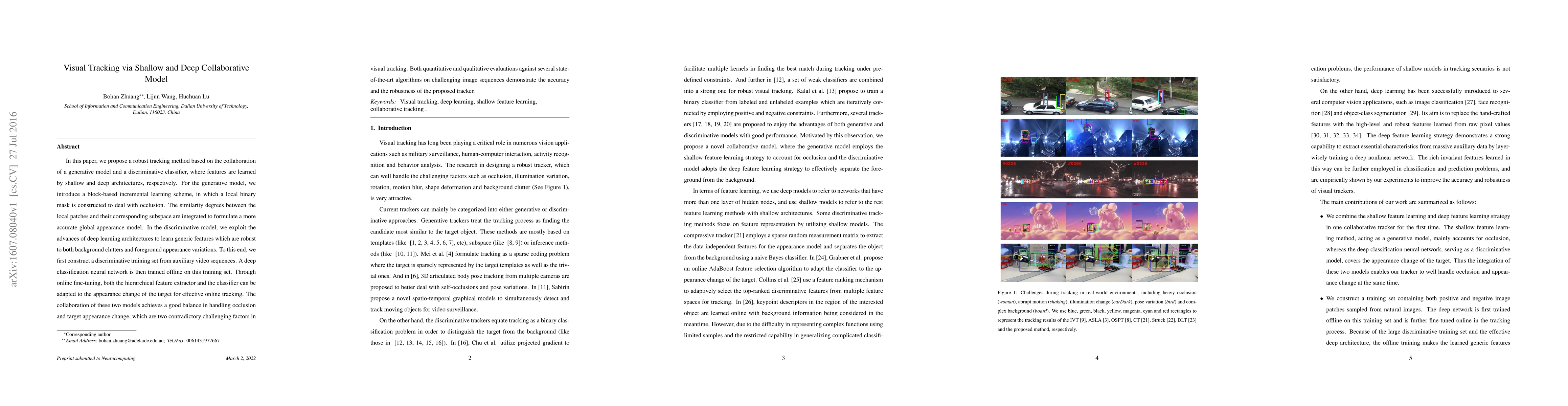 This paper proposes a robust visual tracking method that combines a generative model with a discriminative classifier. The generative model uses shallow learning for incremental feature adaptation, while the discriminative model leverages deep learning for robust feature extraction, achieving effective tracking despite occlusion and appearance changes.