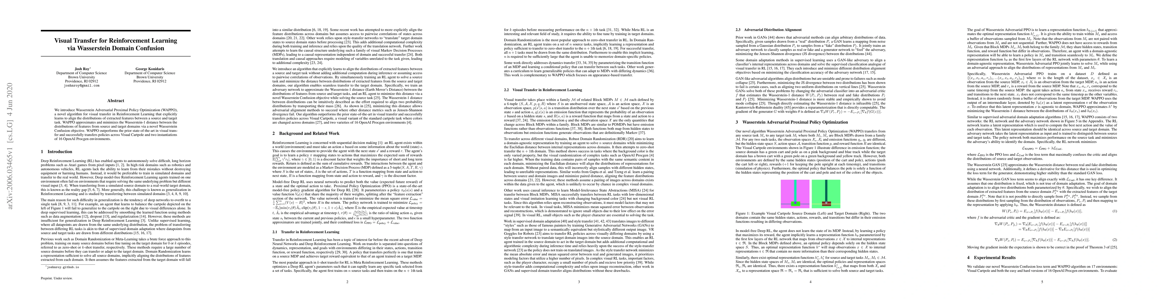 WAPPO introduces a novel Wasserstein Confusion objective term that forces the RL agent to learn a mapping from visually distinct domains to domain-agnostic representations, enabling state-of-the-art domain adaptation performance in Reinforcement Learning.