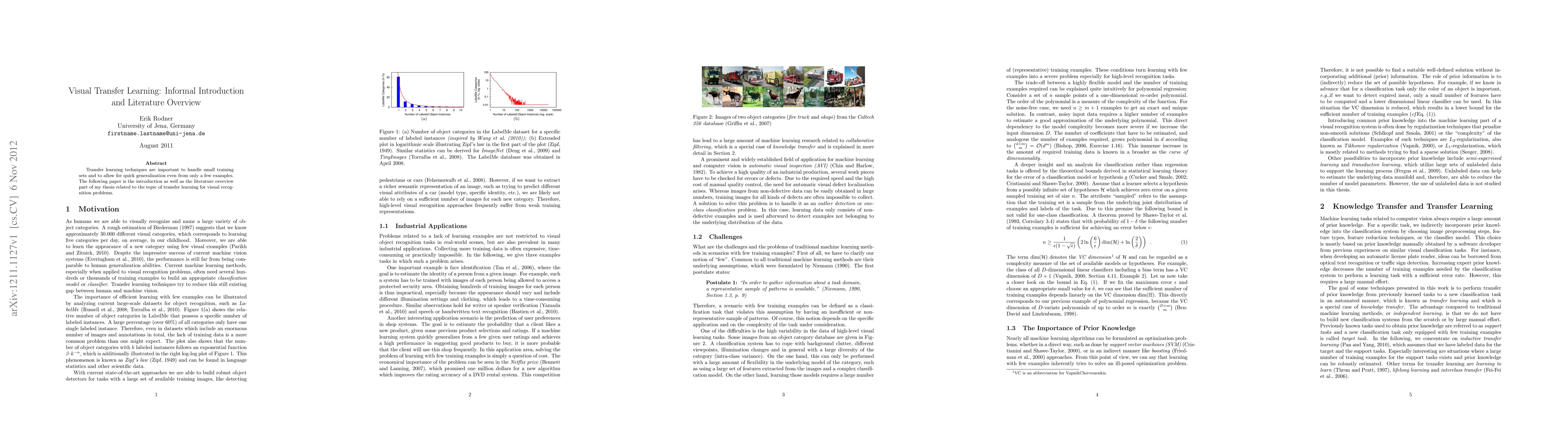 Transfer learning techniques are important to handle small training sets and to allow for quick generalization even from only a few examples. The following paper is the introduction as well as the literature overview part of my thesis related to the topic of transfer learning for visual recognition problems.