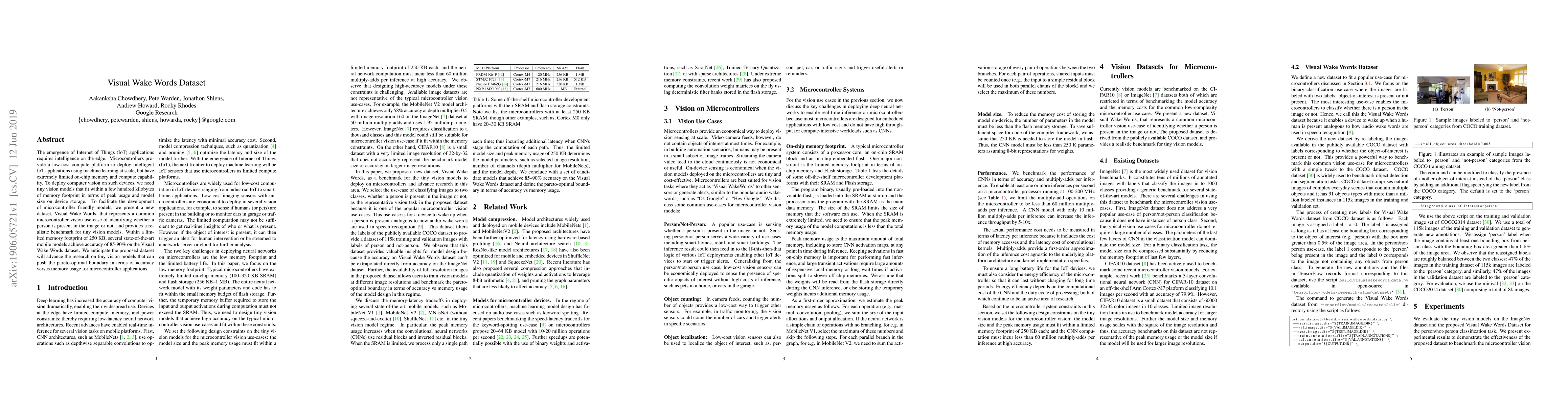 This paper introduces the Visual Wake Words dataset, designed for developing tiny computer vision models suitable for microcontrollers with limited memory and compute power. The dataset focuses on person-presence detection, achieving 85-90% accuracy within a 250KB footprint. It aims to advance research in tiny models optimized for microcontroller IoT applications.