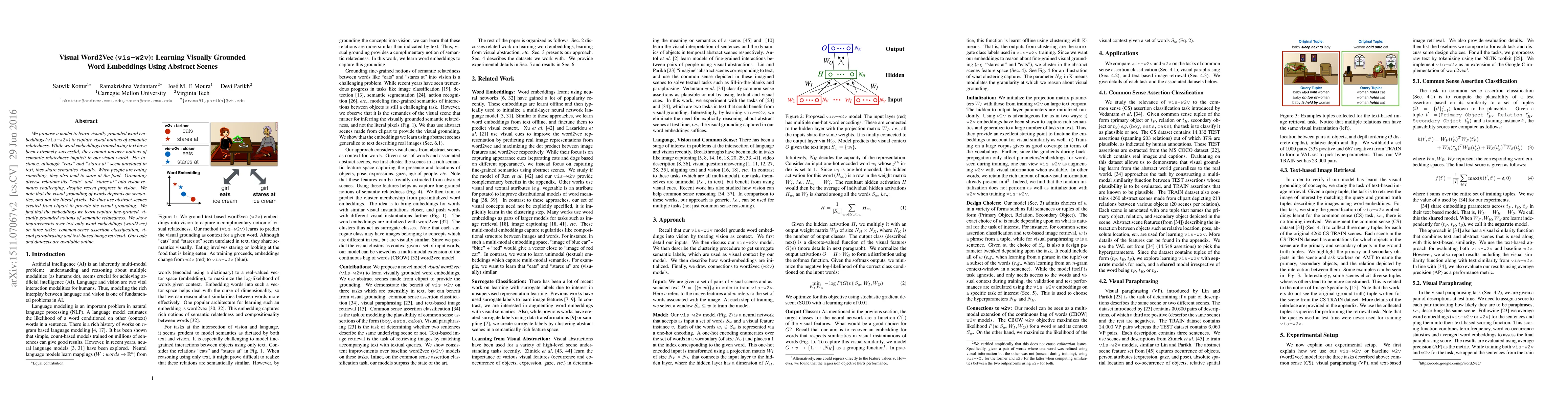 This paper proposes a model called Visual Word2Vec (vis-w2v) to learn visually grounded word embeddings using abstract scenes, aiming to capture semantic relatedness implicit in visual contexts. The model shows improvements over text-only embeddings in common-sense assertion classification, visual paraphrasing, and text-based image retrieval.