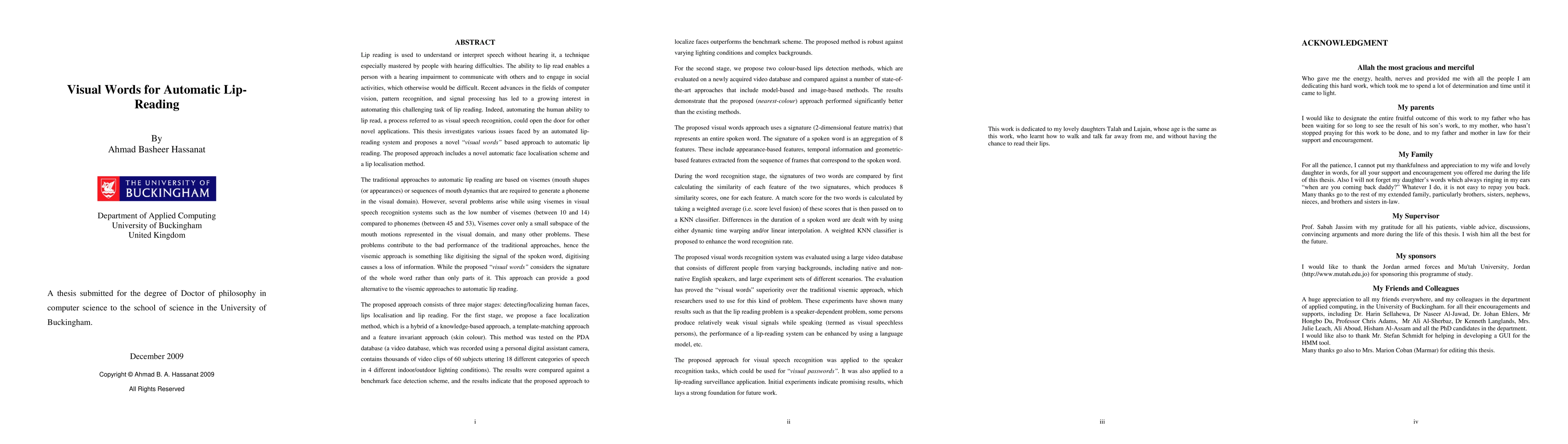 This paper explores the automation of lip reading through visual speech recognition, proposing a "visual words" approach that includes an automatic face localization scheme and a lip localization method to address challenges faced by automated lip-reading systems. The aim is to enable communication for individuals with hearing impairments.