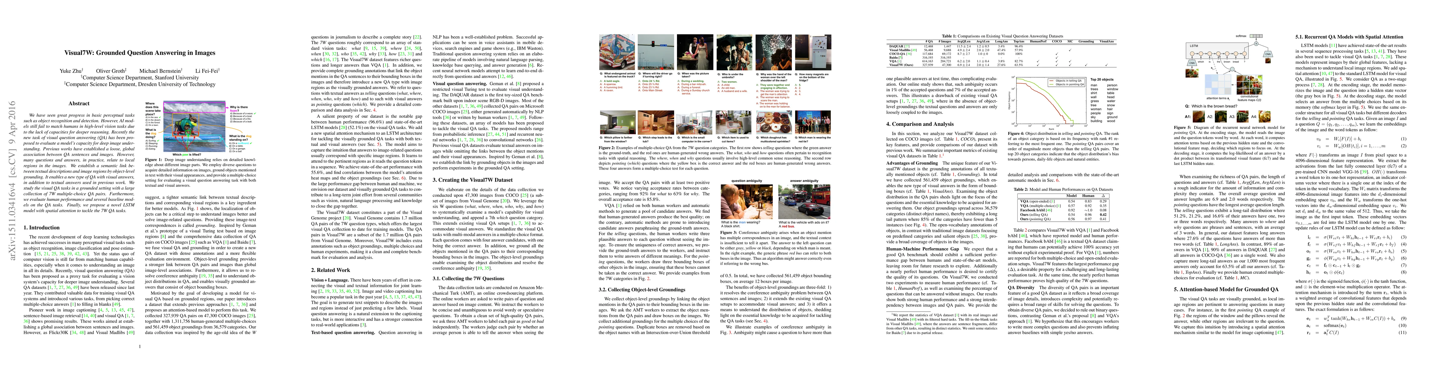We have seen great progress in basic perceptual tasks such as object recognition and detection. However, AI models still fail to match humans in high-level vision tasks due to the lack of capacities for deeper reasoning. Recently the new task of visual question answering (QA) has been proposed to evaluate a model's capacity for deep image understanding. Previous works have established a loose, global association between QA sentences and images. However, many questions and answers, in practice, relate to local regions in the images. We establish a semantic link between textual descriptions and image regions by object-level grounding. It enables a new type of QA with visual answers, in addition to textual answers used in previous work. We study the visual QA tasks in a grounded setting with a large collection of 7W multiple-choice QA pairs. Furthermore, we evaluate human performance and several baseline models on the QA tasks. Finally, we propose a novel LSTM model with spatial attention to tackle the 7W QA tasks.