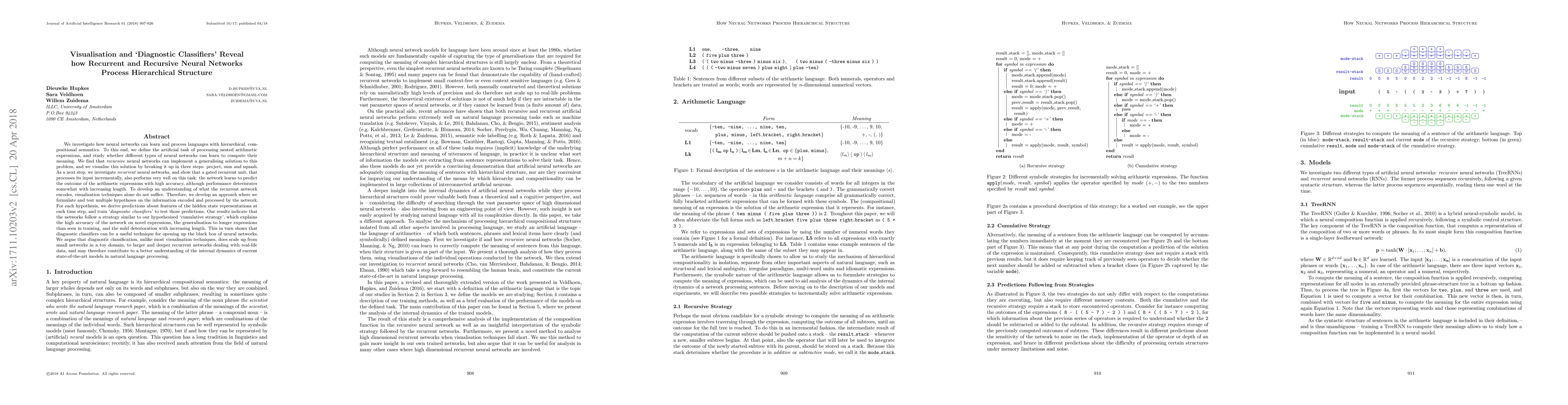 This paper explores how different neural networks process hierarchical structures by examining their performance on nested arithmetic expressions. It finds that recursive networks and gated recurrent units both effectively solve the task, but diagnostic classifiers are necessary to understand the recurrent network's internal encoding, revealing a cumulative strategy that aids in generalization and performance.