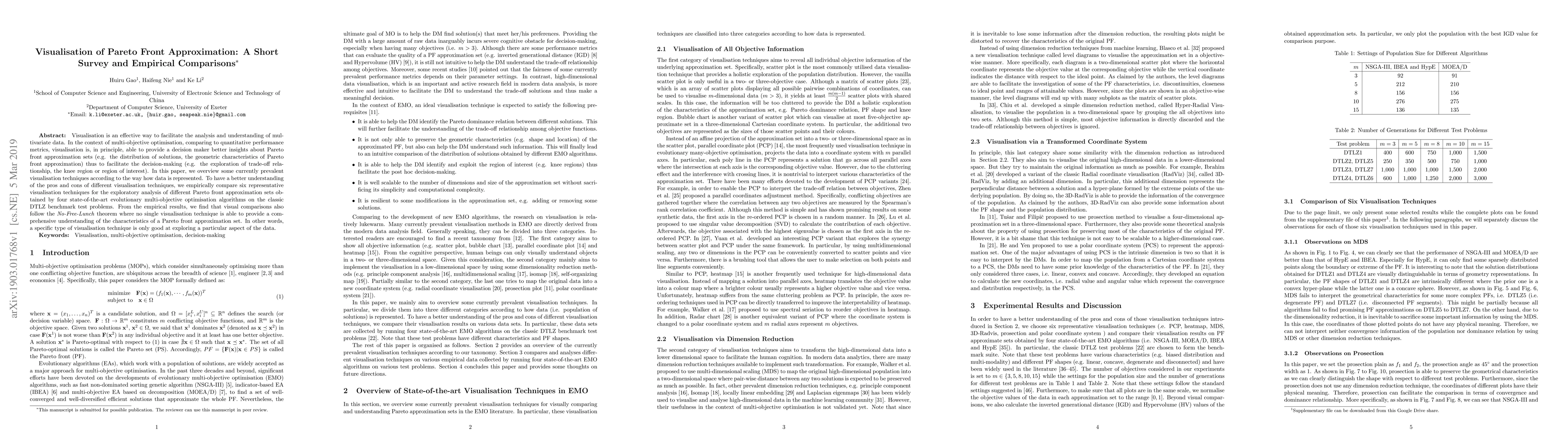 Visualisation is an effective way to facilitate the analysis and understanding of multivariate data. In the context of multi-objective optimisation, comparing to quantitative performance metrics, visualisation is, in principle, able to provide a decision maker better insights about Pareto front approximation sets (e.g. the distribution of solutions, the geometric characteristics of Pareto front approximation) thus to facilitate the decision-making (e.g. the exploration of trade-off relationship, the knee region or region of interest). In this paper, we overview some currently prevalent visualisation techniques according to the way how data is represented. To have a better understanding of the pros and cons of different visualisation techniques, we empirically compare six representative visualisation techniques for the exploratory analysis of different Pareto front approximation sets obtained by four state-of-the-art evolutionary multi-objective optimisation algorithms on the classic DTLZ benchmark test problems. From the empirical results, we find that visual comparisons also follow the \textit{No-Free-Lunch} theorem where no single visualisation technique is able to provide a comprehensive understanding of the characteristics of a Pareto front approximation set. In other words, a specific type of visualisation technique is only good at exploring a particular aspect of the data.