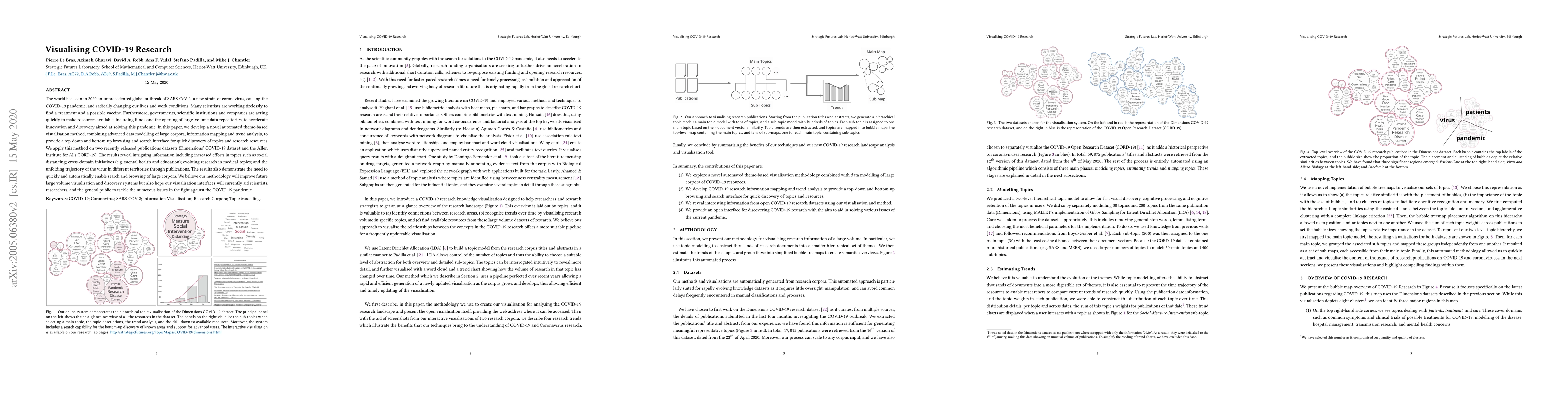 The world has seen in 2020 an unprecedented global outbreak of SARS-CoV-2, a new strain of coronavirus, causing the COVID-19 pandemic, and radically changing our lives and work conditions. Many scientists are working tirelessly to find a treatment and a possible vaccine. Furthermore, governments, scientific institutions and companies are acting quickly to make resources available, including funds and the opening of large-volume data repositories, to accelerate innovation and discovery aimed at solving this pandemic. In this paper, we develop a novel automated theme-based visualisation method, combining advanced data modelling of large corpora, information mapping and trend analysis, to provide a top-down and bottom-up browsing and search interface for quick discovery of topics and research resources. We apply this method on two recently released publications datasets (Dimensions' COVID-19 dataset and the Allen Institute for AI's CORD-19). The results reveal intriguing information including increased efforts in topics such as social distancing; cross-domain initiatives (e.g. mental health and education); evolving research in medical topics; and the unfolding trajectory of the virus in different territories through publications. The results also demonstrate the need to quickly and automatically enable search and browsing of large corpora. We believe our methodology will improve future large volume visualisation and discovery systems but also hope our visualisation interfaces will currently aid scientists, researchers, and the general public to tackle the numerous issues in the fight against the COVID-19 pandemic.