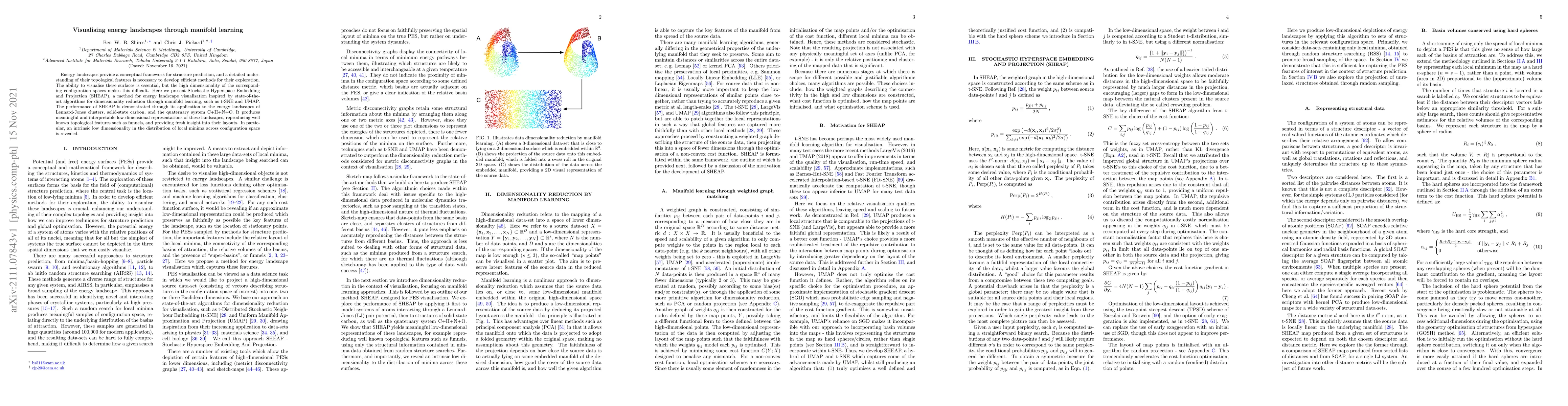 Energy landscapes provide a conceptual framework for structure prediction, and a detailed understanding of their topological features is necessary to develop efficient methods for their exploration. The ability to visualise these surfaces is essential, but the high dimensionality of the corresponding configuration spaces makes this difficult. Here we present Stochastic Hyperspace Embedding and Projection (SHEAP), a method for energy landscape visualisation inspired by state-of-the-art algorithms for dimensionality reduction through manifold learning, such as t-SNE and UMAP. The performance of SHEAP is demonstrated through its application to the energy landscapes of Lennard-Jones clusters, solid-state carbon, and the quaternary system C+H+N+O. It produces meaningful and interpretable low-dimensional representations of these landscapes, reproducing well known topological features such as funnels, and providing fresh insight into their layouts. In particular, an intrinsic low dimensionality in the distribution of local minima across configuration space is revealed.