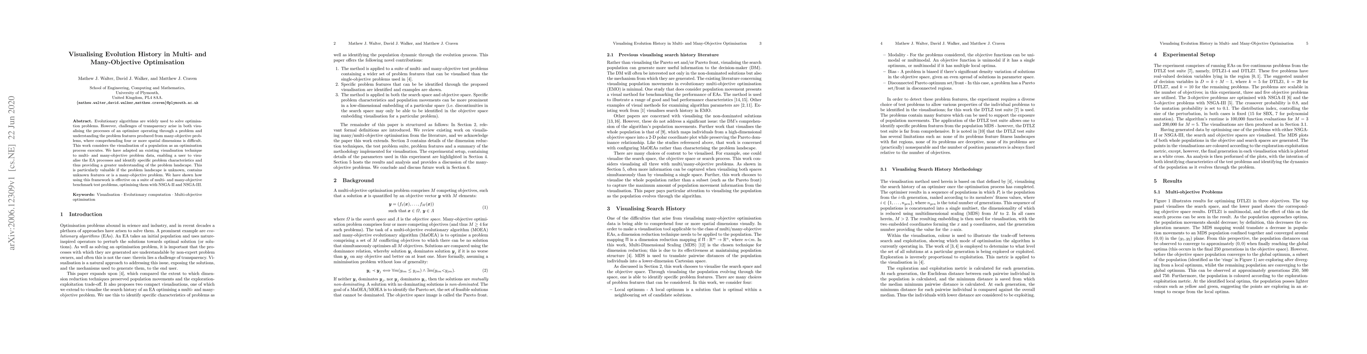Evolutionary algorithms are widely used to solve optimisation problems. However, challenges of transparency arise in both visualising the processes of an optimiser operating through a problem and understanding the problem features produced from many-objective problems, where comprehending four or more spatial dimensions is difficult. This work considers the visualisation of a population as an optimisation process executes. We have adapted an existing visualisation technique to multi- and many-objective problem data, enabling a user to visualise the EA processes and identify specific problem characteristics and thus providing a greater understanding of the problem landscape. This is particularly valuable if the problem landscape is unknown, contains unknown features or is a many-objective problem. We have shown how using this framework is effective on a suite of multi- and many-objective benchmark test problems, optimising them with NSGA-II and NSGA-III.