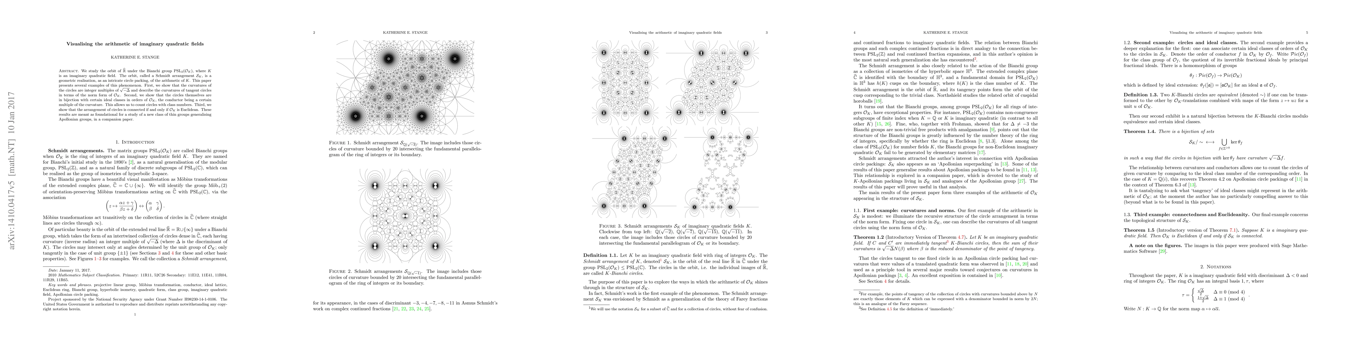 We study the orbit of $\mathbb{R}$ under the Bianchi group $\operatorname{PSL}_2(\mathcal{O}_K)$, where $K$ is an imaginary quadratic field. The orbit, called a Schmidt arrangement $\mathcal{S}_K$, is a geometric realisation, as an intricate circle packing, of the arithmetic of $K$. This paper presents several examples of this phenomenon. First, we show that the curvatures of the circles are integer multiples of $\sqrt{-\Delta}$ and describe the curvatures of tangent circles in terms of the norm form of $\mathcal{O}_K$. Second, we show that the circles themselves are in bijection with certain ideal classes in orders of $\mathcal{O}_K$, the conductor being a certain multiple of the curvature. This allows us to count circles with class numbers. Third, we show that the arrangement of circles is connected if and only if $\mathcal{O}_K$ is Euclidean. These results are meant as foundational for a study of a new class of thin groups generalising Apollonian groups, in a companion paper.