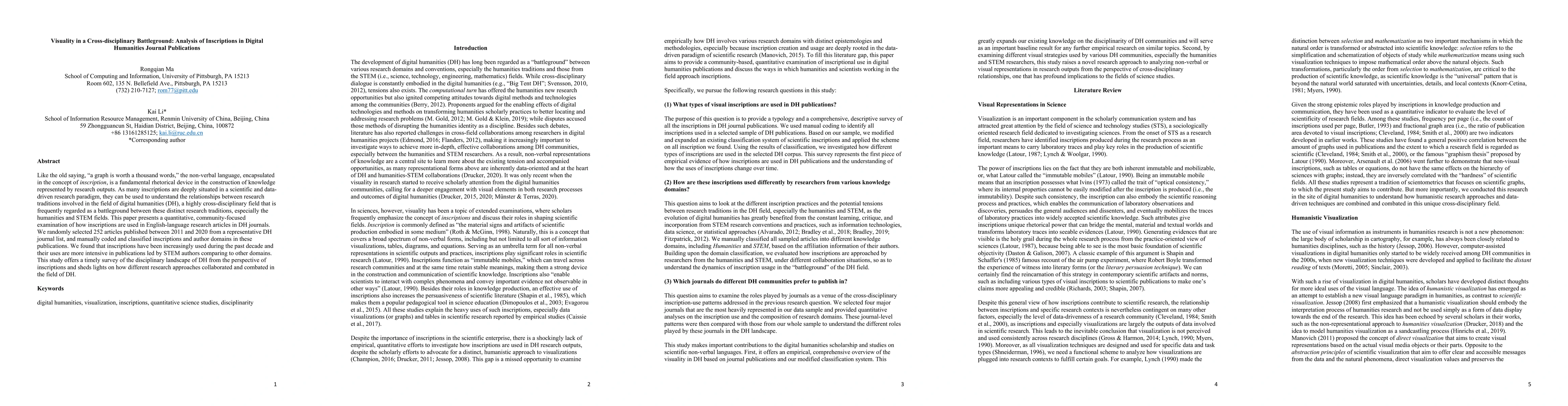 Like the old saying, "a graph is worth a thousand words," the non-verbal language, encapsulated in the concept of inscription, is a fundamental rhetorical device in the construction of knowledge represented by research outputs. As many inscriptions are deeply situated in a scientific and data-driven research paradigm, they can be used to understand the relationships between research traditions involved in the field of digital humanities (DH), a highly cross-disciplinary field that is frequently regarded as a battleground between these distinct research traditions, especially the humanities and STEM fields. This paper presents a quantitative, community-focused examination of how inscriptions are used in English-language research articles in DH journals. We randomly selected 252 articles published between 2011 and 2020 from a representative DH journal list, and manually coded and classified inscriptions and author domains in these publications. We found that inscriptions have been increasingly used during the past decade and their uses are more intensive in publications led by STEM authors comparing to other domains. This study offers a timely survey of the disciplinary landscape of DH from the perspective of inscriptions and sheds light on how different research approaches collaborated and combated in the field of DH.