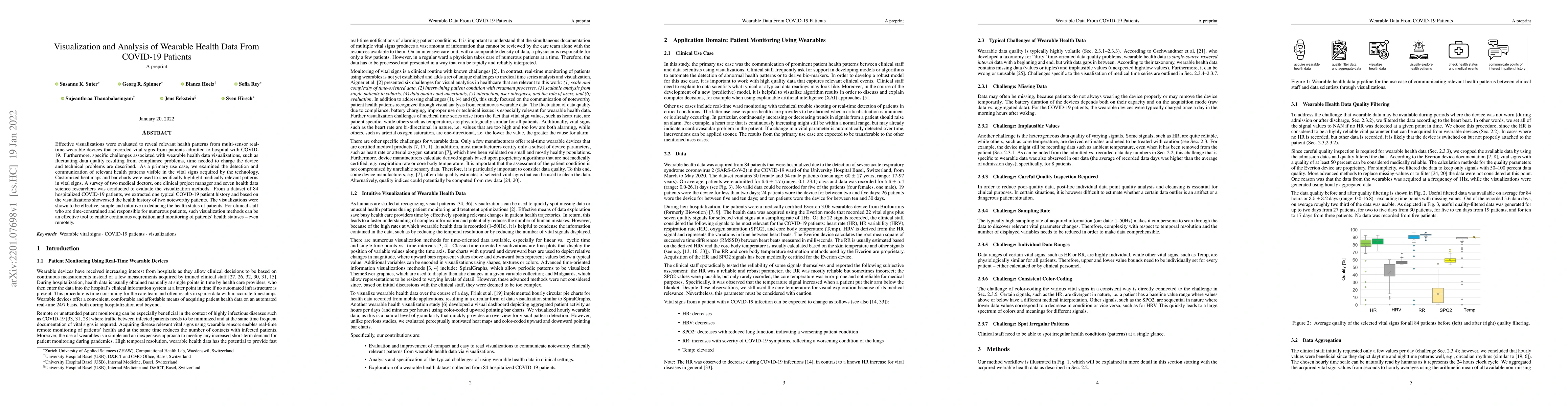Effective visualizations were evaluated to reveal relevant health patterns from multi-sensor real-time wearable devices that recorded vital signs from patients admitted to hospital with COVID-19. Furthermore, specific challenges associated with wearable health data visualizations, such as fluctuating data quality resulting from compliance problems, time needed to charge the device and technical problems are described. As a primary use case, we examined the detection and communication of relevant health patterns visible in the vital signs acquired by the technology. Customized heat maps and bar charts were used to specifically highlight medically relevant patterns in vital signs. A survey of two medical doctors, one clinical project manager and seven health data science researchers was conducted to evaluate the visualization methods. From a dataset of 84 hospitalized COVID-19 patients, we extracted one typical COVID-19 patient history and based on the visualizations showcased the health history of two noteworthy patients. The visualizations were shown to be effective, simple and intuitive in deducing the health status of patients. For clinical staff who are time-constrained and responsible for numerous patients, such visualization methods can be an effective tool to enable continuous acquisition and monitoring of patients' health statuses even remotely.