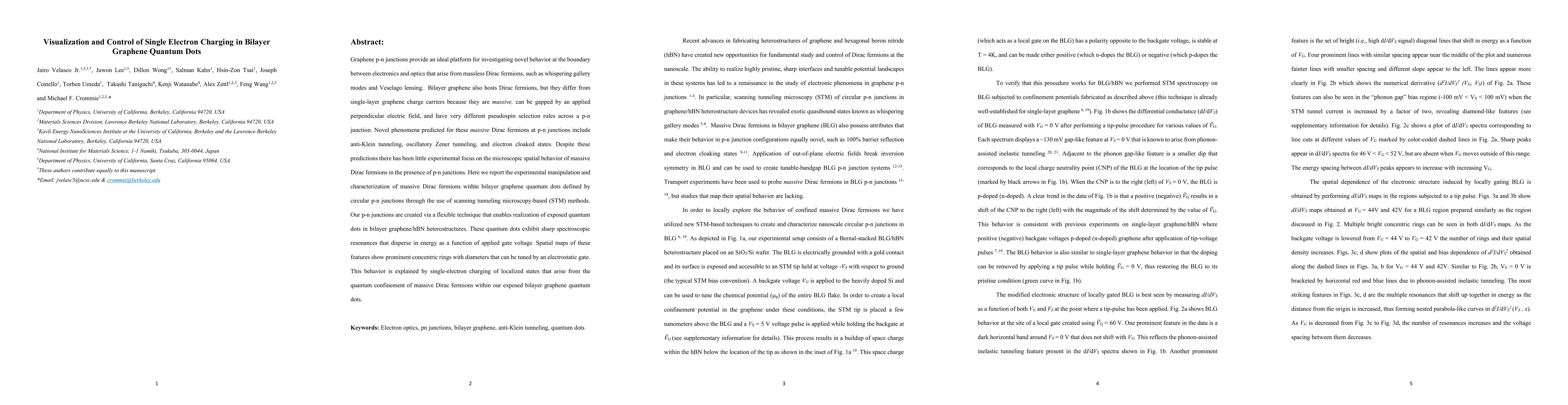 This paper reports the visualization and control of single electron charging in bilayer graphene quantum dots via scanning tunneling microscopy. The study reveals concentric ring patterns, tunable by gate voltage, due to the quantum confinement of massive Dirac fermions within the defined circular p-n junctions.