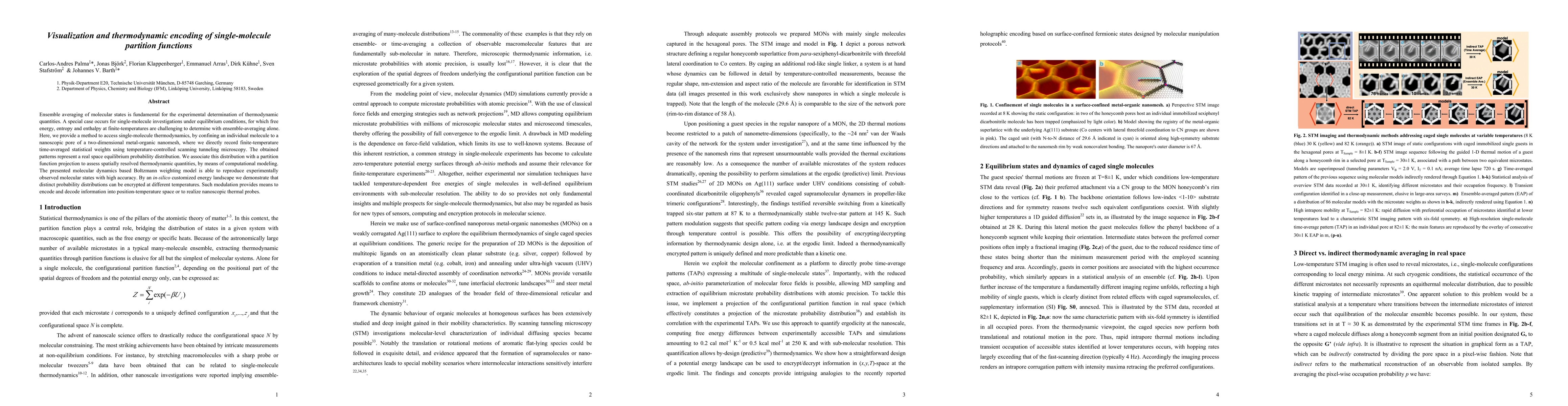 Ensemble averaging of molecular states is fundamental for the experimental determination of thermodynamic quantities. A special case occurs for single-molecule investigations under equilibrium conditions, for which free energy, entropy and enthalpy at finite-temperatures are challenging to determine with ensemble-averaging alone. Here, we provide a method to access single-molecule thermodynamics, by confining an individual molecule to a nanoscopic pore of a two-dimensional metal-organic nanomesh, where we directly record finite-temperature time-averaged statistical weights using temperature-controlled scanning tunneling microscopy. The obtained patterns represent a real space equilibrium probability distribution. We associate this distribution with a partition function projection to assess spatially resolved thermodynamic quantities, by means of computational modeling. The presented molecular dynamics based Boltzmann weighting model is able to reproduce experimentally observed molecular states with high accuracy. By an in-silico customized energy landscape we demonstrate that distinct probability distributions can be encrypted at different temperatures. Such modulation provides means to encode and decode information into position-temperature space or to realize nanoscopic thermal probes.