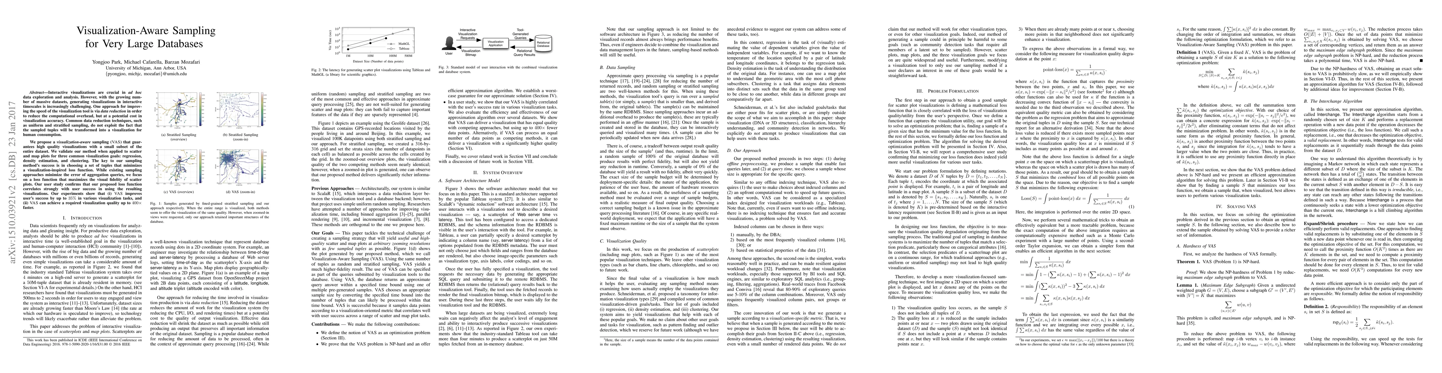 Interactive visualizations are crucial in ad hoc data exploration and analysis. However, with the growing number of massive datasets, generating visualizations in interactive timescales is increasingly challenging. One approach for improving the speed of the visualization tool is via data reduction in order to reduce the computational overhead, but at a potential cost in visualization accuracy. Common data reduction techniques, such as uniform and stratified sampling, do not exploit the fact that the sampled tuples will be transformed into a visualization for human consumption. We propose a visualization-aware sampling (VAS) that guarantees high quality visualizations with a small subset of the entire dataset. We validate our method when applied to scatter and map plots for three common visualization goals: regression, density estimation, and clustering. The key to our sampling method's success is in choosing tuples which minimize a visualization-inspired loss function. Our user study confirms that optimizing this loss function correlates strongly with user success in using the resulting visualizations. We also show the NP-hardness of our optimization problem and propose an efficient approximation algorithm. Our experiments show that, compared to previous methods, (i) using the same sample size, VAS improves user's success by up to 35% in various visualization tasks, and (ii) VAS can achieve a required visualization quality up to 400 times faster.