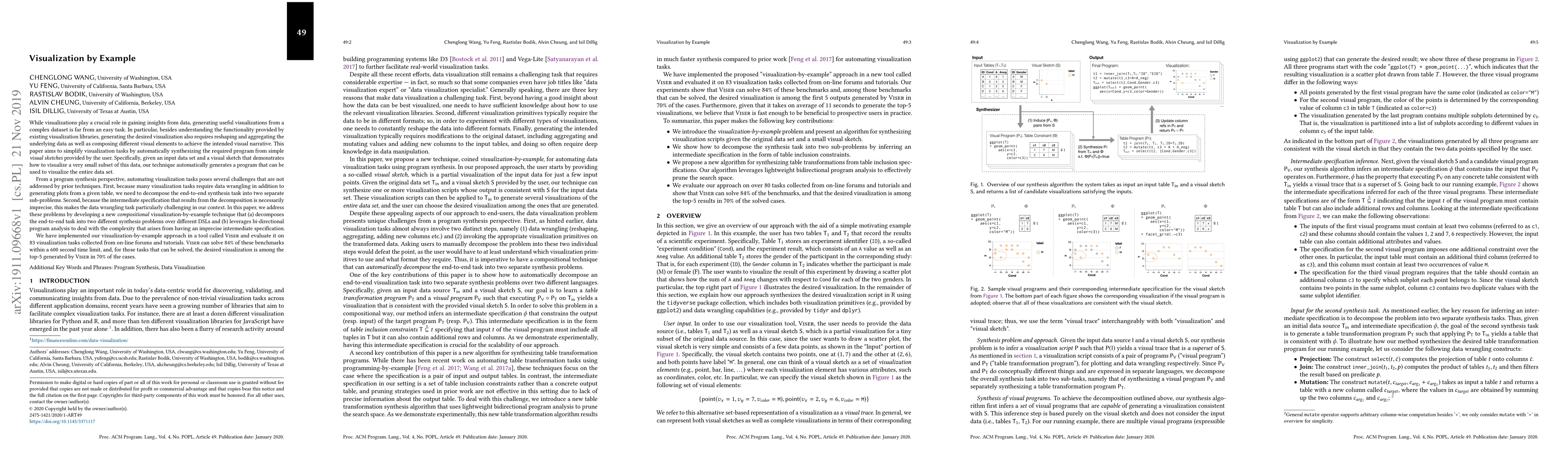 While visualizations play a crucial role in gaining insights from data, generating useful visualizations from a complex dataset is far from an easy task. Besides understanding the functionality provided by existing visualization libraries, generating the desired visualization also requires reshaping and aggregating the underlying data as well as composing different visual elements to achieve the intended visual narrative. This paper aims to simplify visualization tasks by automatically synthesizing the required program from simple visual sketches provided by the user. Specifically, given an input data set and a visual sketch that demonstrates how to visualize a very small subset of this data, our technique automatically generates a program that can be used to visualize the entire data set. Automating visualization poses several challenges. First, because many visualization tasks require data wrangling in addition to generating plots, we need to decompose the end-to-end synthesis task into two separate sub-problems. Second, because the intermediate specification that results from the decomposition is necessarily imprecise, this makes the data wrangling task particularly challenging in our context. In this paper, we address these problems by developing a new compositional visualization-by-example technique that (a) decomposes the end-to-end task into two different synthesis problems over different DSLs and (b) leverages bi-directional program analysis to deal with the complexity that arises from having an imprecise intermediate specification. We implemented our visualization-by-example algorithm and evaluate it on 83 visualization tasks collected from on-line forums and tutorials. Viser can solve 84% of these benchmarks within a 600 second time limit, and, for those tasks that can be solved, the desired visualization is among the top-5 generated by Viser in 70% of the cases.
