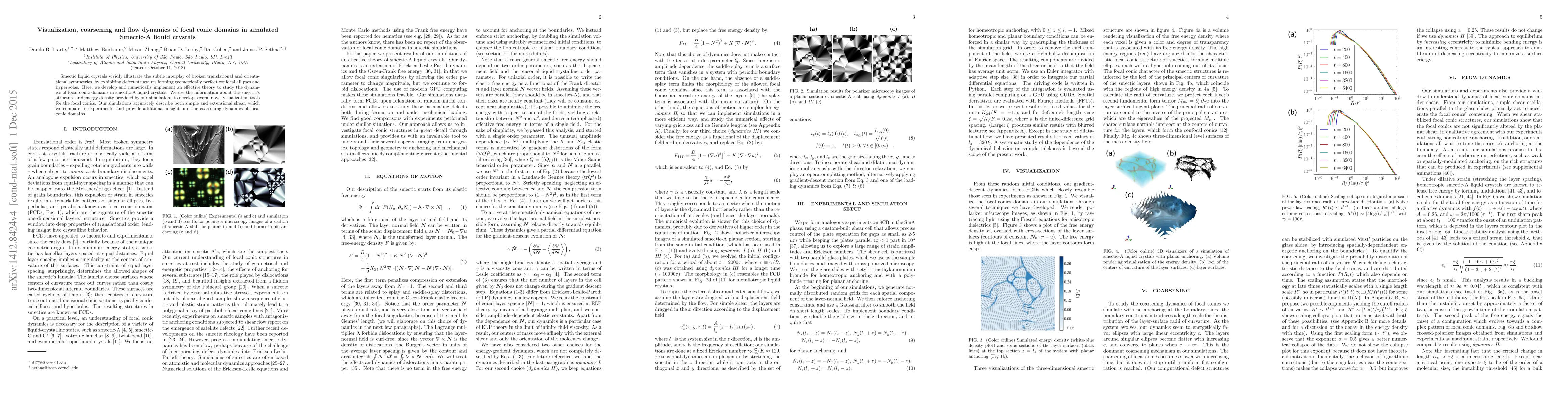 Smectic liquid crystals vividly illustrate the subtle interplay of broken translational and orientational symmetries, by exhibiting defect structures forming geometrically perfect confocal ellipses and hyperbolas. Here, we develop and numerically implement an effective theory to study the dynamics of focal conic domains in smectic-A liquid crystals. We use the information about the smectic's structure and energy density provided by our simulations to develop several novel visualization tools for the focal conics. Our simulations accurately describe both simple and extensional shear, which we compare to experiments, and provide additional insight into the coarsening dynamics of focal conic domains.