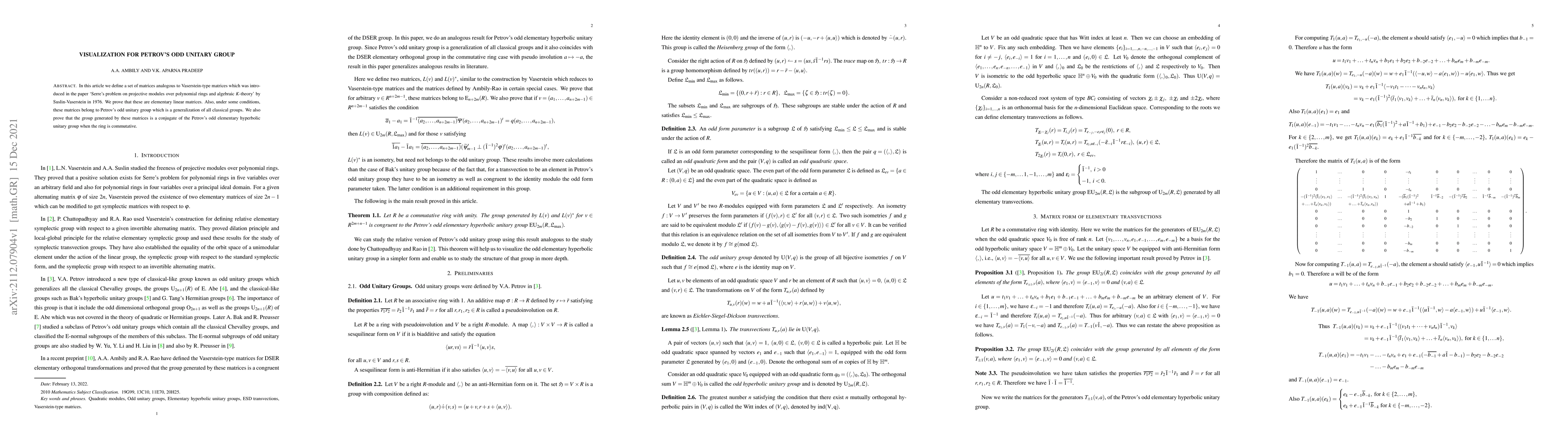 This paper defines a new set of elementary linear matrices analogous to Vaserstein-type matrices, proving they belong to Petrov's odd unitary group under certain conditions. It further demonstrates that the group generated by these matrices is a conjugate of Petrov's odd elementary hyperbolic unitary group in commutative rings.