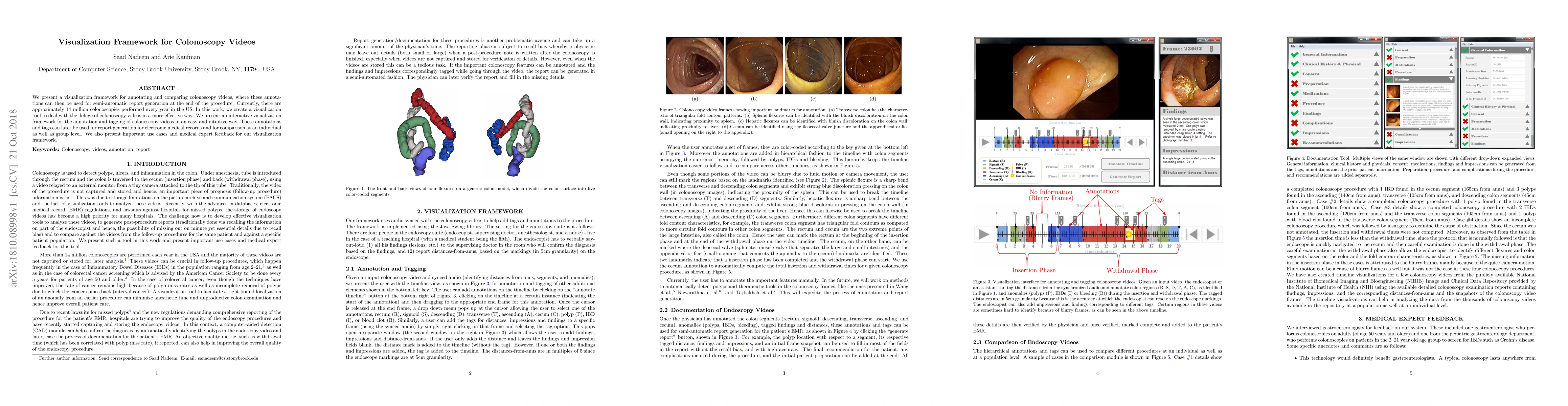 We present a visualization framework for annotating and comparing colonoscopy videos, where these annotations can then be used for semi-automatic report generation at the end of the procedure. Currently, there are approximately 14 million colonoscopies performed every year in the US. In this work, we create a visualization tool to deal with the deluge of colonoscopy videos in a more effective way. We present an interactive visualization framework for the annotation and tagging of colonoscopy videos in an easy and intuitive way. These annotations and tags can later be used for report generation for electronic medical records and for comparison at an individual as well as group level. We also present important use cases and medical expert feedback for our visualization framework.