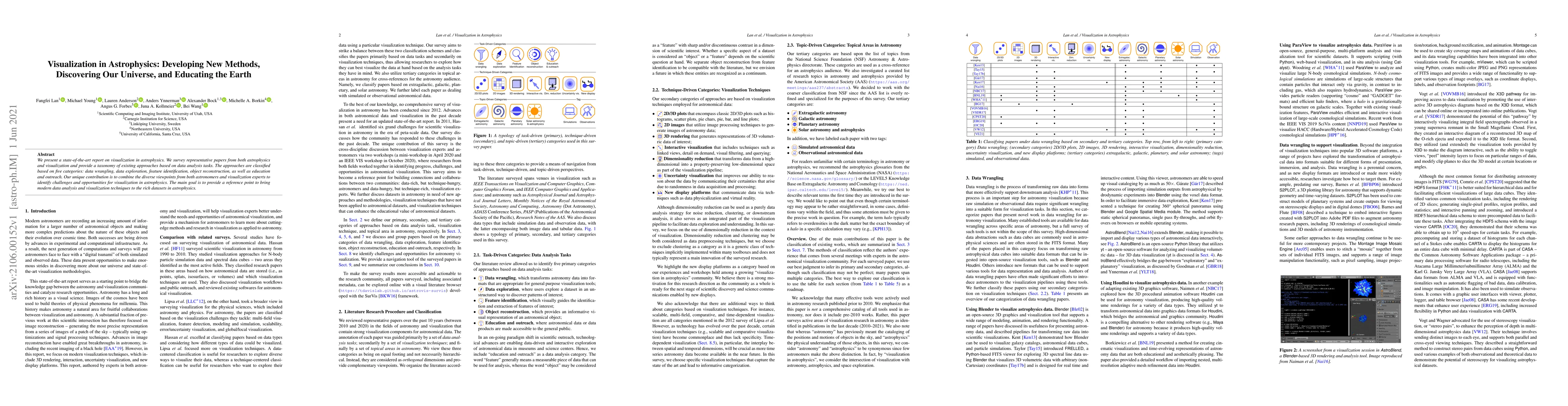 We present a state-of-the-art report on visualization in astrophysics. We survey representative papers from both astrophysics and visualization and provide a taxonomy of existing approaches based on data analysis tasks. The approaches are classified based on five categories: data wrangling, data exploration, feature identification, object reconstruction, as well as education and outreach. Our unique contribution is to combine the diverse viewpoints from both astronomers and visualization experts to identify challenges and opportunities for visualization in astrophysics. The main goal is to provide a reference point to bring modern data analysis and visualization techniques to the rich datasets in astrophysics.