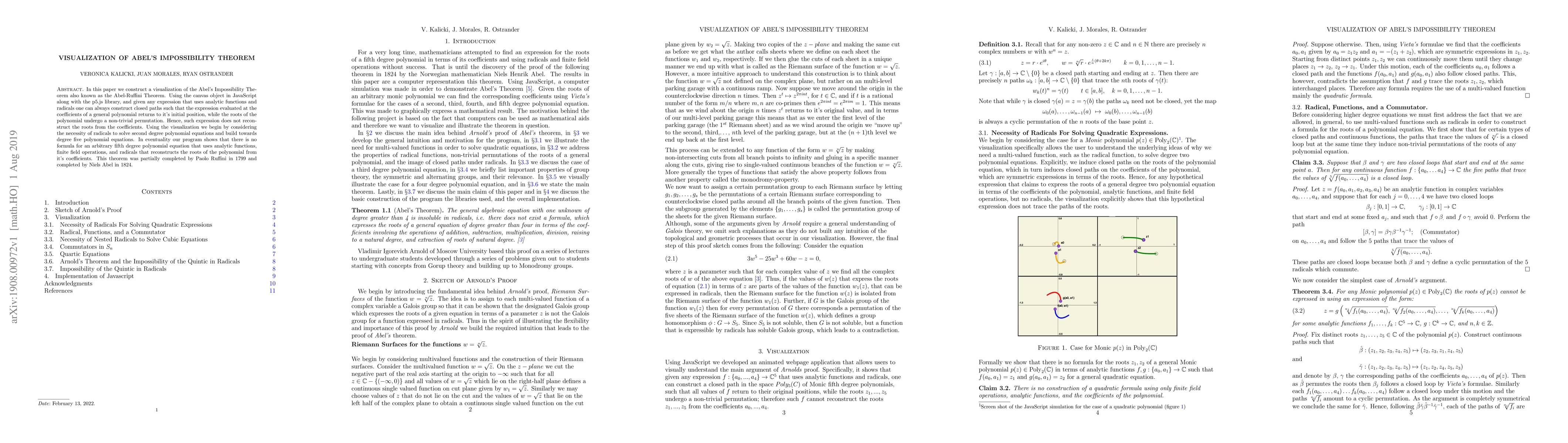 In this paper we construct a visualization of the Abel's Impossibility Theorem also known as the Abel-Ruffini Theorem. Using the canvas object in JavaScript along with the p5.js library, and given any expression that uses analytic functions and radicals one can always construct closed paths such that the expression evaluated at the coefficients of a general polynomial returns to it's initial position, while the roots of the polynomial undergo a non-trivial permutation. Hence, such expression does not reconstruct the roots from the coefficients. Using the visualization we begin by considering the necessity of radicals to solve second degree polynomial equations and build towards degree five polynomial equations. In eventuality our program shows that there is no formula for an arbitrary fifth degree polynomial equation that uses analytic functions, finite field operations, and radicals that reconstructs the roots of the polynomial from it's coefficients. This theorem was partially completed by Paolo Ruffini in 1799 and completed by Niels Abel in 1824.