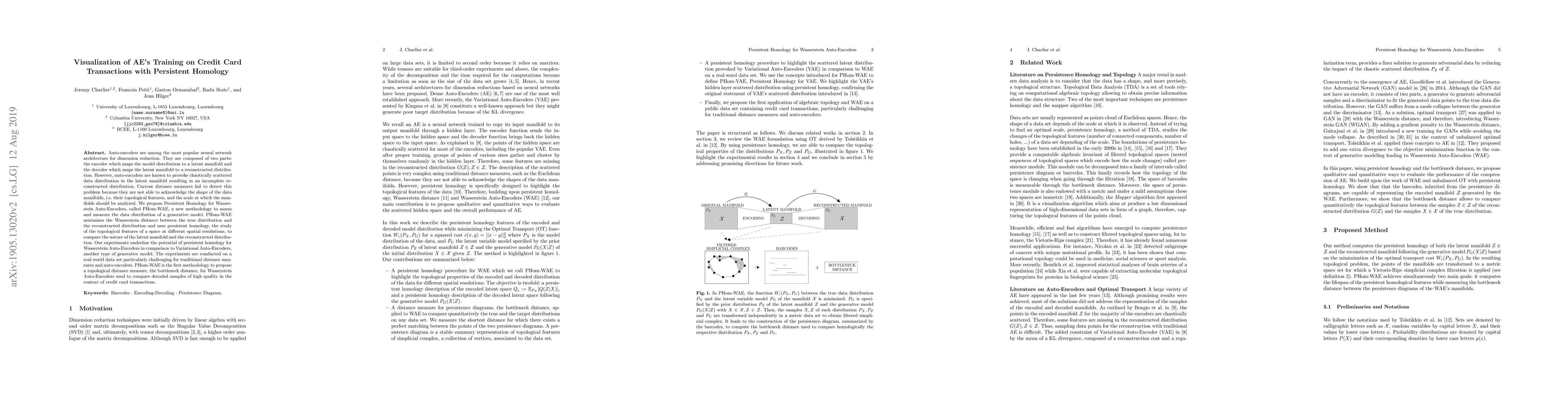 Auto-encoders are among the most popular neural network architecture for dimension reduction. They are composed of two parts: the encoder which maps the model distribution to a latent manifold and the decoder which maps the latent manifold to a reconstructed distribution. However, auto-encoders are known to provoke chaotically scattered data distribution in the latent manifold resulting in an incomplete reconstructed distribution. Current distance measures fail to detect this problem because they are not able to acknowledge the shape of the data manifolds, i.e. their topological features, and the scale at which the manifolds should be analyzed. We propose Persistent Homology for Wasserstein Auto-Encoders, called PHom-WAE, a new methodology to assess and measure the data distribution of a generative model. PHom-WAE minimizes the Wasserstein distance between the true distribution and the reconstructed distribution and uses persistent homology, the study of the topological features of a space at different spatial resolutions, to compare the nature of the latent manifold and the reconstructed distribution. Our experiments underline the potential of persistent homology for Wasserstein Auto-Encoders in comparison to Variational Auto-Encoders, another type of generative model. The experiments are conducted on a real-world data set particularly challenging for traditional distance measures and auto-encoders. PHom-WAE is the first methodology to propose a topological distance measure, the bottleneck distance, for Wasserstein Auto-Encoders used to compare decoded samples of high quality in the context of credit card transactions.