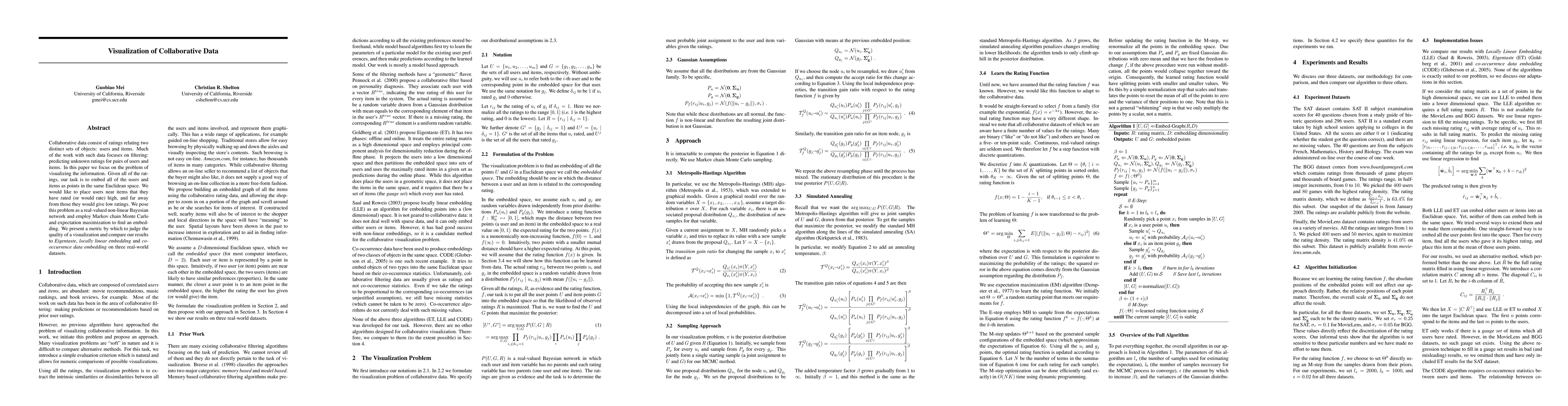 This paper proposes a visualization method for collaborative data by embedding users and items into a Euclidean space based on their ratings. It uses a real-valued non-linear Bayesian network with Markov chain Monte Carlo and expectation maximization to achieve this, and compares its results with local linear embedding and Eigentaste on three real-world datasets.