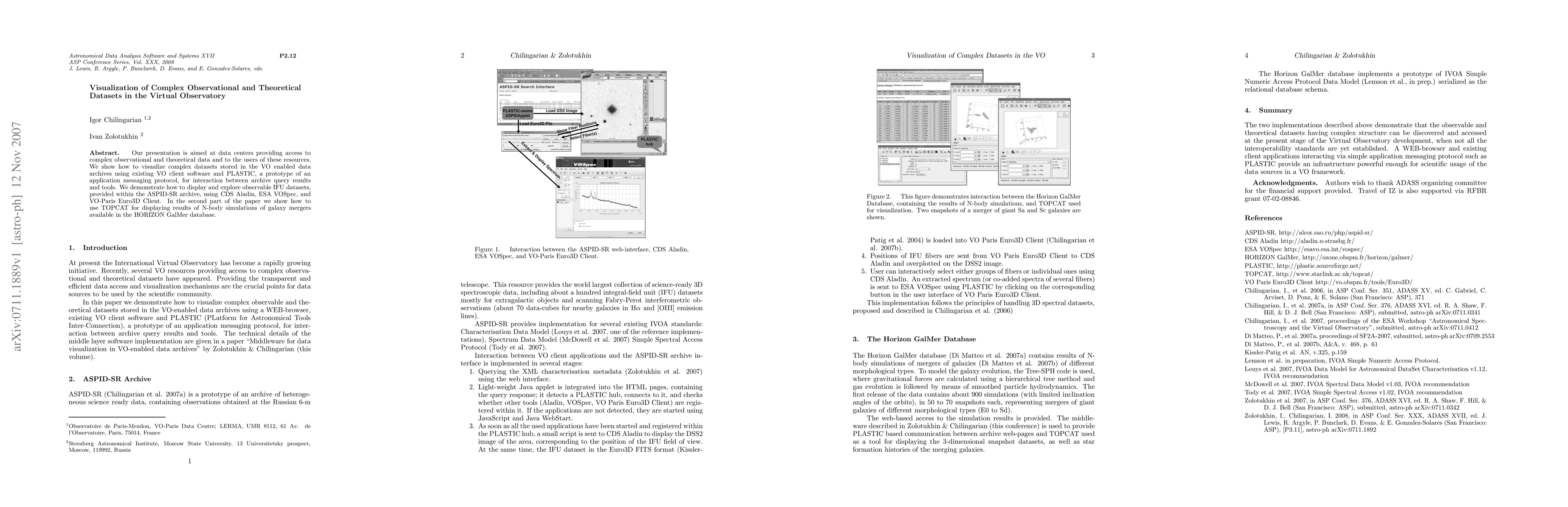 This paper presents methods for visualizing complex observational and theoretical datasets in the Virtual Observatory (VO) using VO client software and a prototype messaging protocol called PLASTIC. It demonstrates the use of various tools like CDS Aladin and TOPCAT to explore datasets from archives such as ASPID-SR and HORIZON GalMer.