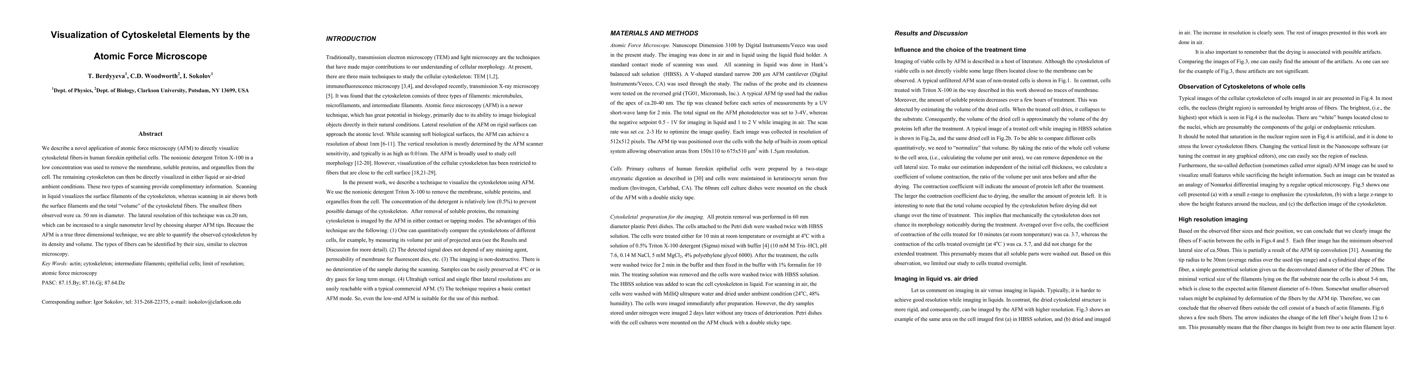 We describe a novel application of atomic force microscopy (AFM) to directly visualize cytoskeletal fibers in human foreskin epithelial cells. The nonionic detergent Triton X-100 in a low concentration was used to remove the membrane, soluble proteins, and organelles from the cell. The remaining cytoskeleton can then be directly visualized in either liquid or air-dried ambient conditions. These two types of scanning provide complimentary information. Scanning in liquid visualizes the surface filaments of the cytoskeleton, whereas scanning in air shows both the surface filaments and the total "volume" of the cytoskeletal fibers. The smallest fibers observed were ca. 50 nm in diameter. The lateral resolution of this technique was ca.20 nm, which can be increased to a single nanometer level by choosing sharper AFM tips. Because the AFM is a true three dimensional technique, we are able to quantify the observed cytoskeleton by its density and volume. The types of fibers can be identified by their size, similar to electron microscopy.