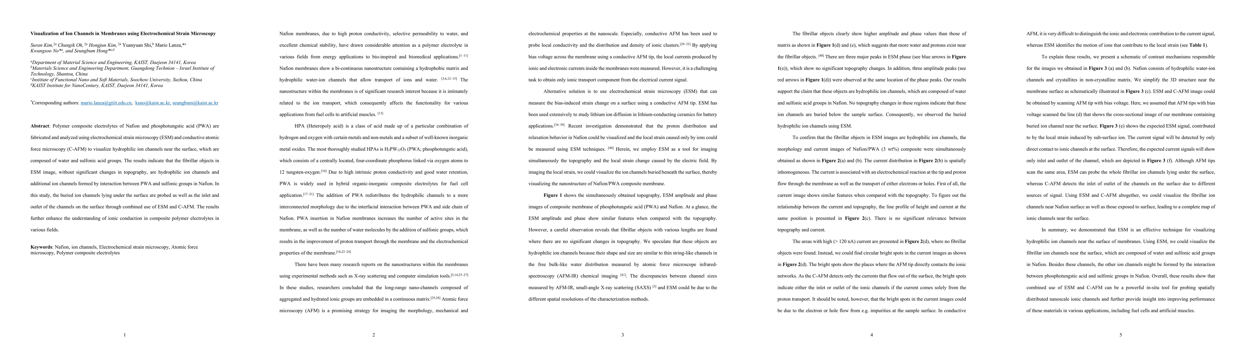 This paper utilizes electrochemical strain microscopy (ESM) and conductive atomic force microscopy (C-AFM) to visualize hydrophilic ion channels in Nafion-phosphotungstic acid composite electrolytes. The findings reveal fibrillar ion channels formed by interactions between PWA and Nafion's sulfonic groups, enhancing understanding of ionic conduction in polymer electrolytes.