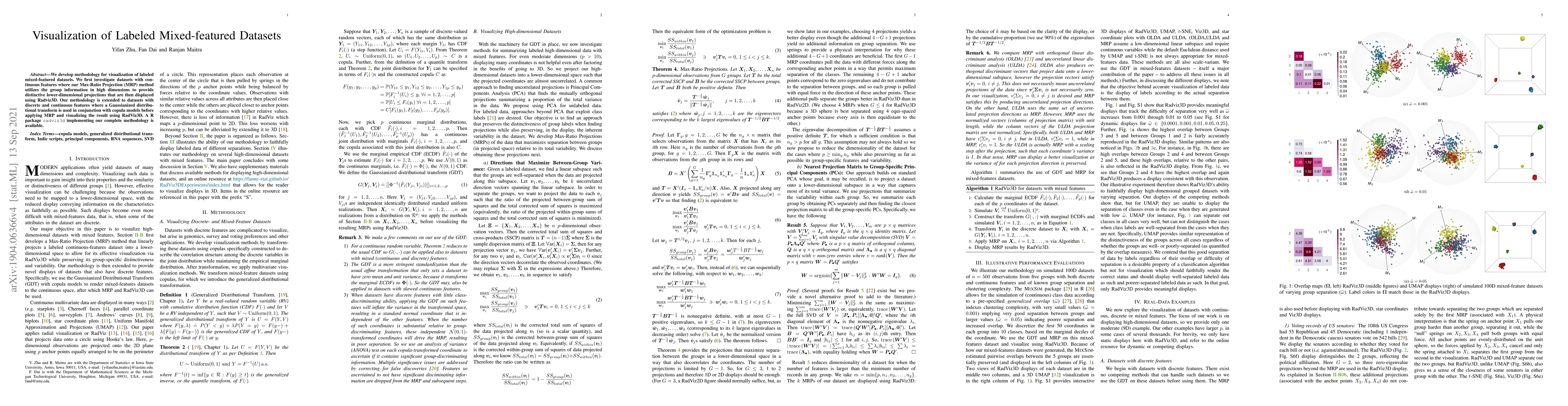 This research introduces a methodology for visualizing labeled mixed-featured datasets using Max-Ratio Projection (MRP) and Radviz3D. It extends the approach to handle both continuous and discrete features through Gaussianized distributional transforms and copula models, with a complete implementation available in the R package radviz3d.