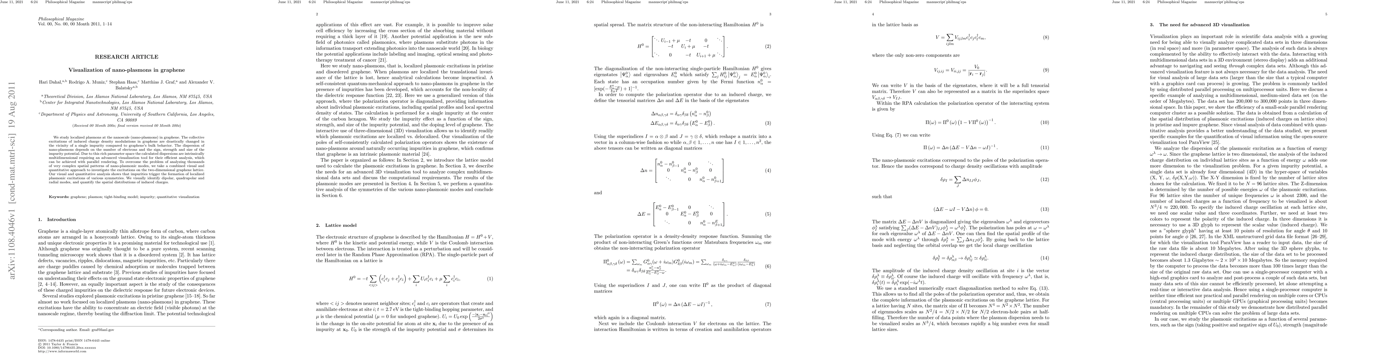 This paper investigates localized nano-plasmons in graphene, revealing how impurities alter their collective excitations. Advanced visualization and parallel rendering techniques are employed to analyze the complex multidimensional dispersions, identifying dipolar, quadrupolar, and radial plasmonic modes.