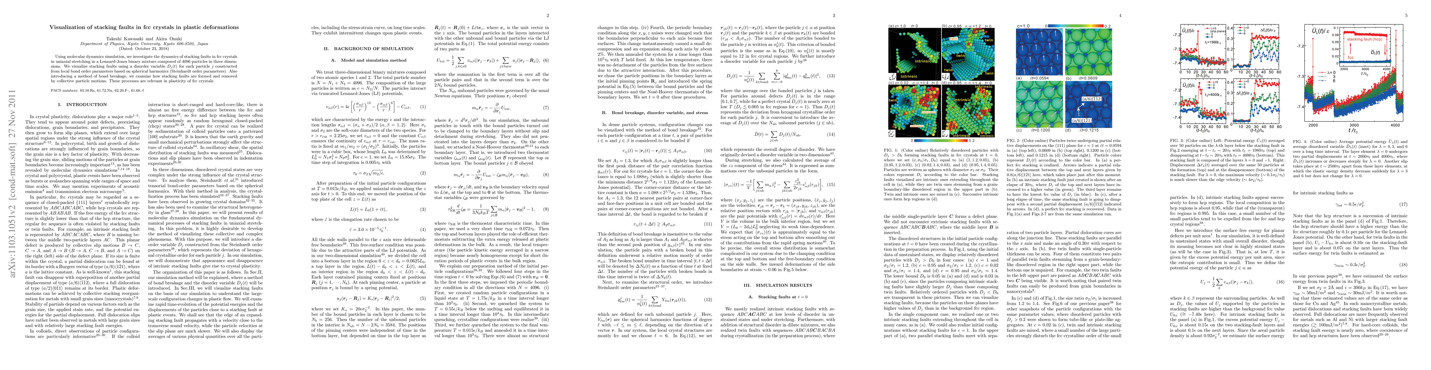 This research employs molecular dynamics simulation to visualize stacking faults in fcc crystals during uniaxial stretching using a Lennard-Jones binary mixture. It introduces a disorder variable based on spherical harmonics to track these faults and examines their formation and removal through collective particle motions.