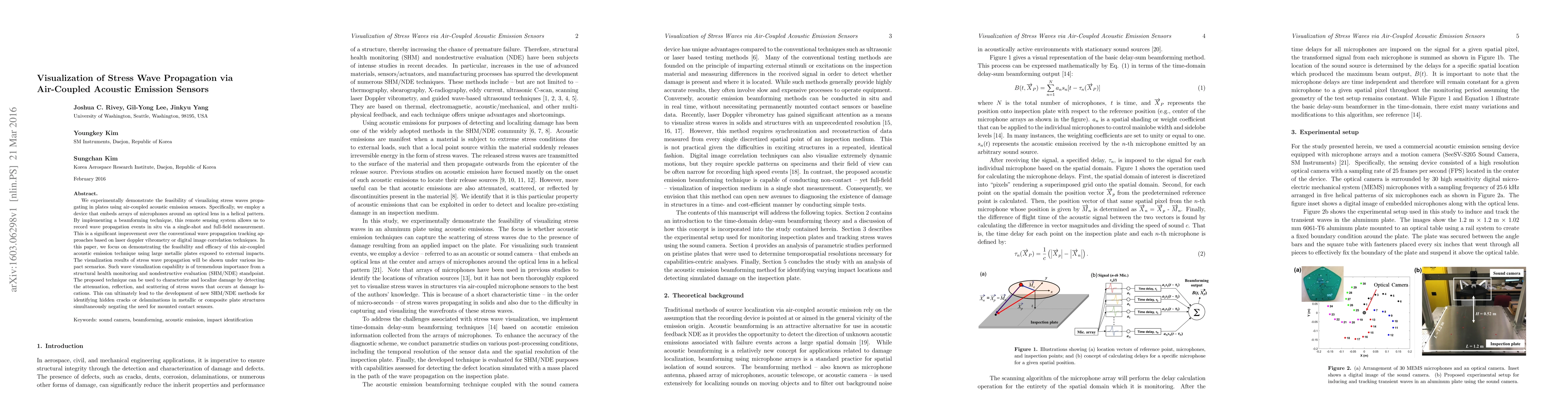 This paper demonstrates the use of air-coupled acoustic emission sensors to visualize stress wave propagation in plates, employing a helical microphone array and beamforming for remote sensing. The technique offers significant improvements over traditional methods, enabling full-field, single-shot measurements for structural health monitoring and nondestructive evaluation.