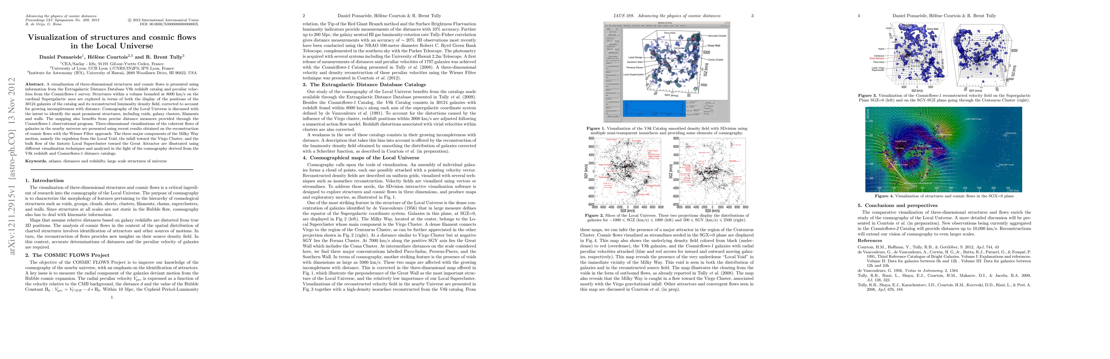 This paper presents a three-dimensional visualization of cosmic structures and flows in the Local Universe using data from the Extragalactic Distance Database and Cosmicflows-1 survey. It identifies prominent features like voids, clusters, filaments, and walls, highlighting the Milky Way's motion components including its expulsion from the Local Void and infall toward Virgo.