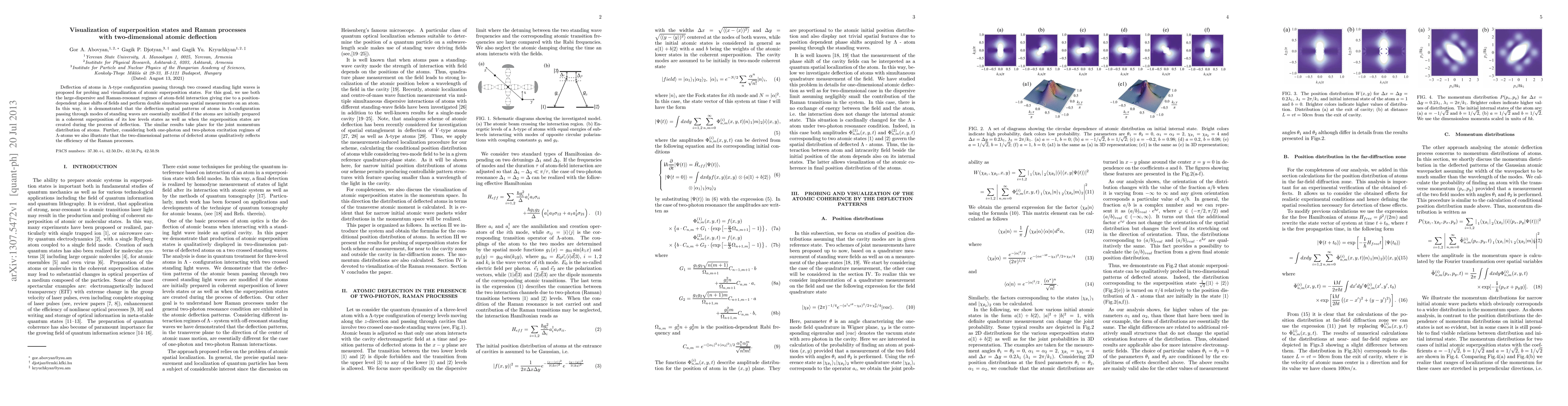 Deflection of atoms in \Lambda-type configuration passing through two crossed standing light waves is proposed for probing and visualization of atomic superposition states. For this goal, we use both the large-dispersive and Raman-resonant regimes of atom-field interaction giving rise to a position-dependent phase shifts of fields and perform double simultaneous spatial measurements on an atom. In this way, it is demonstrated that the deflection spatial patterns of atoms in \Lambda-configuration passing through modes of standing waves are essentially modified if the atoms are initially prepared in a coherent superposition of its low levels states as well as when the superposition states are created during the process of deflection. The similar results take place for the joint momentum distribution of atoms. Further, considering both one-photon and two-photon excitation regimes of \Lambda-atoms we also illustrate that the two-dimensional patterns of defected atoms qualitatively reflects the efficiency of the Raman processes.