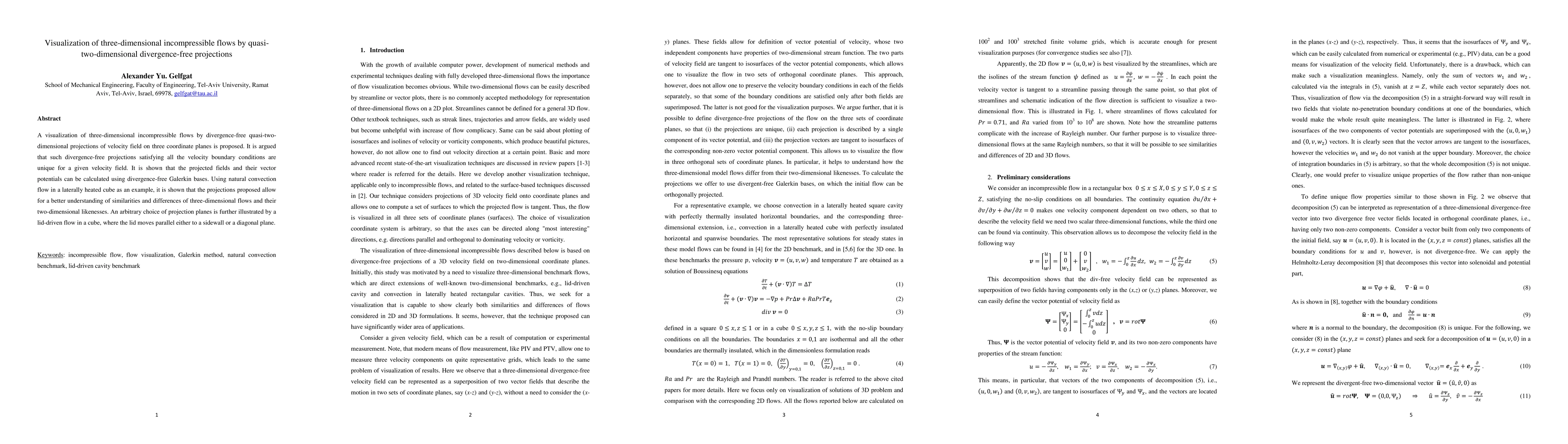 This paper proposes a method for visualizing three-dimensional incompressible flows using unique, divergence-free quasi-two-dimensional projections. It demonstrates that these projections can enhance the understanding of flow similarities and differences by comparing three-dimensional flows with their two-dimensional equivalents, illustrated through natural convection and lid-driven cavity flows.