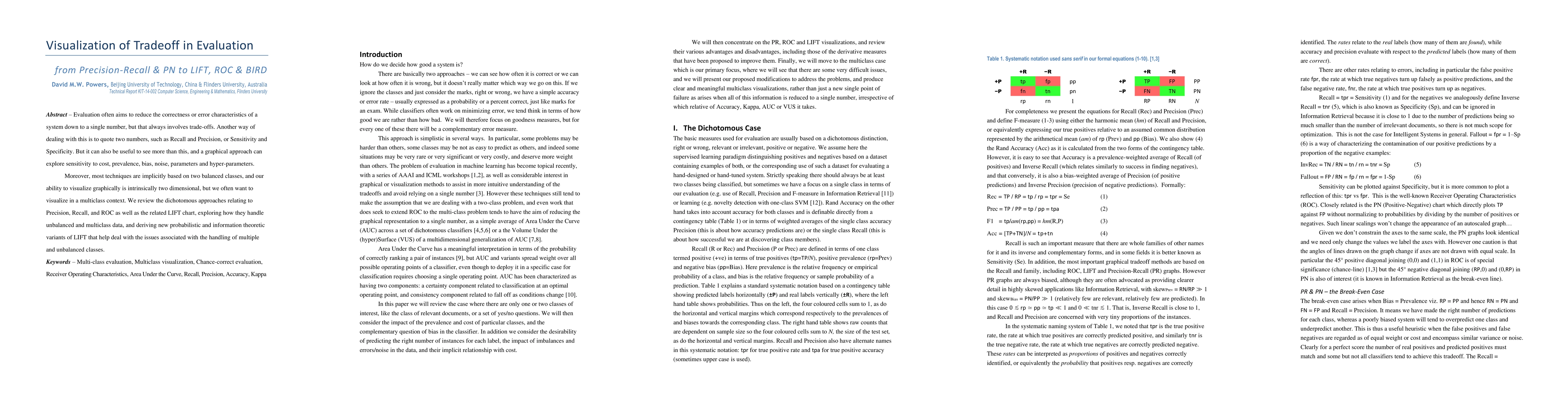 Evaluation often aims to reduce the correctness or error characteristics of a system down to a single number, but that always involves trade-offs. Another way of dealing with this is to quote two numbers, such as Recall and Precision, or Sensitivity and Specificity. But it can also be useful to see more than this, and a graphical approach can explore sensitivity to cost, prevalence, bias, noise, parameters and hyper-parameters. Moreover, most techniques are implicitly based on two balanced classes, and our ability to visualize graphically is intrinsically two dimensional, but we often want to visualize in a multiclass context. We review the dichotomous approaches relating to Precision, Recall, and ROC as well as the related LIFT chart, exploring how they handle unbalanced and multiclass data, and deriving new probabilistic and information theoretic variants of LIFT that help deal with the issues associated with the handling of multiple and unbalanced classes.