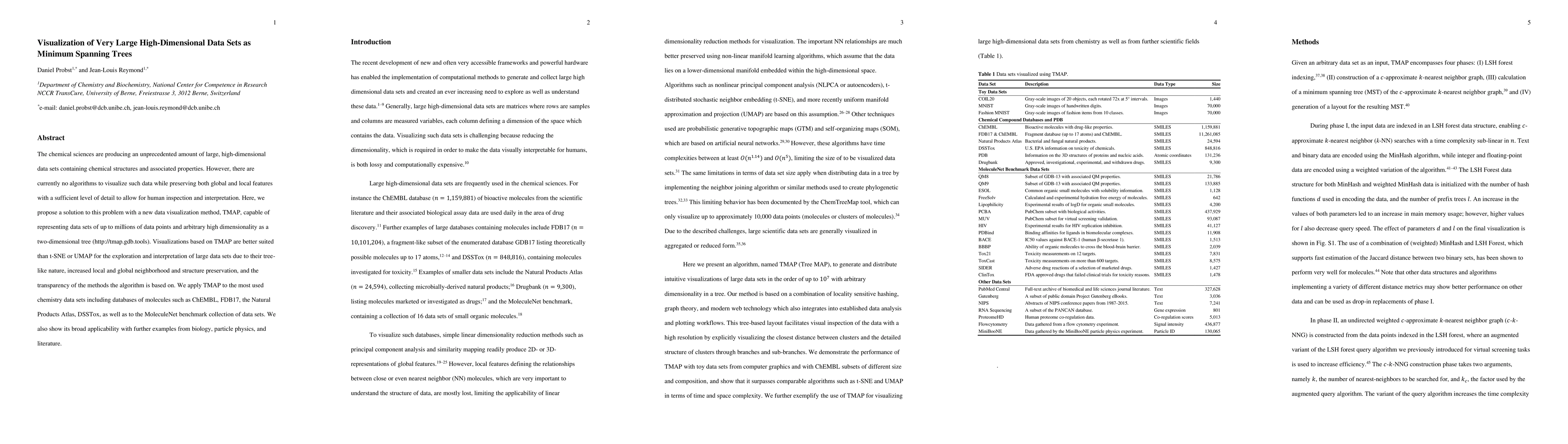 The chemical sciences are producing an unprecedented amount of large, high-dimensional data sets containing chemical structures and associated properties. However, there are currently no algorithms to visualize such data while preserving both global and local features with a sufficient level of detail to allow for human inspection and interpretation. Here, we propose a solution to this problem with a new data visualization method, TMAP, capable of representing data sets of up to millions of data points and arbitrary high dimensionality as a two-dimensional tree (http://tmap.gdb.tools). Visualizations based on TMAP are better suited than t-SNE or UMAP for the exploration and interpretation of large data sets due to their tree-like nature, increased local and global neighborhood and structure preservation, and the transparency of the methods the algorithm is based on. We apply TMAP to the most used chemistry data sets including databases of molecules such as ChEMBL, FDB17, the Natural Products Atlas, DSSTox, as well as to the MoleculeNet benchmark collection of data sets. We also show its broad applicability with further examples from biology, particle physics, and literature.