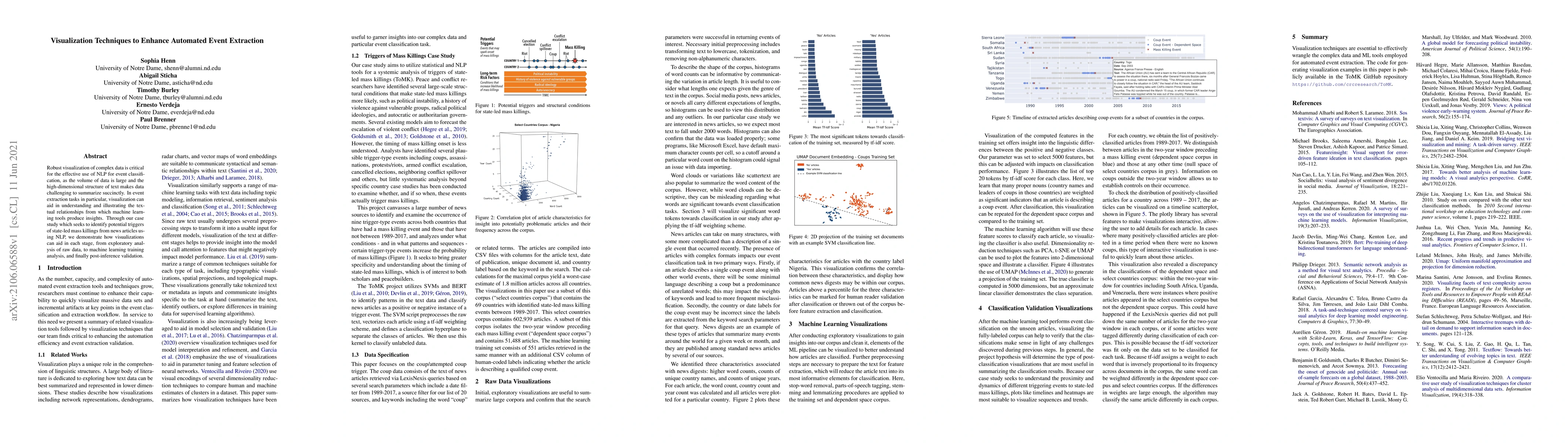 This paper explores how advanced visualization techniques can enhance automated event extraction in NLP, particularly for identifying triggers of state-led mass killings from news articles. It demonstrates the utility of visualizations throughout the process, from initial data exploration to machine learning training and post-inference validation.