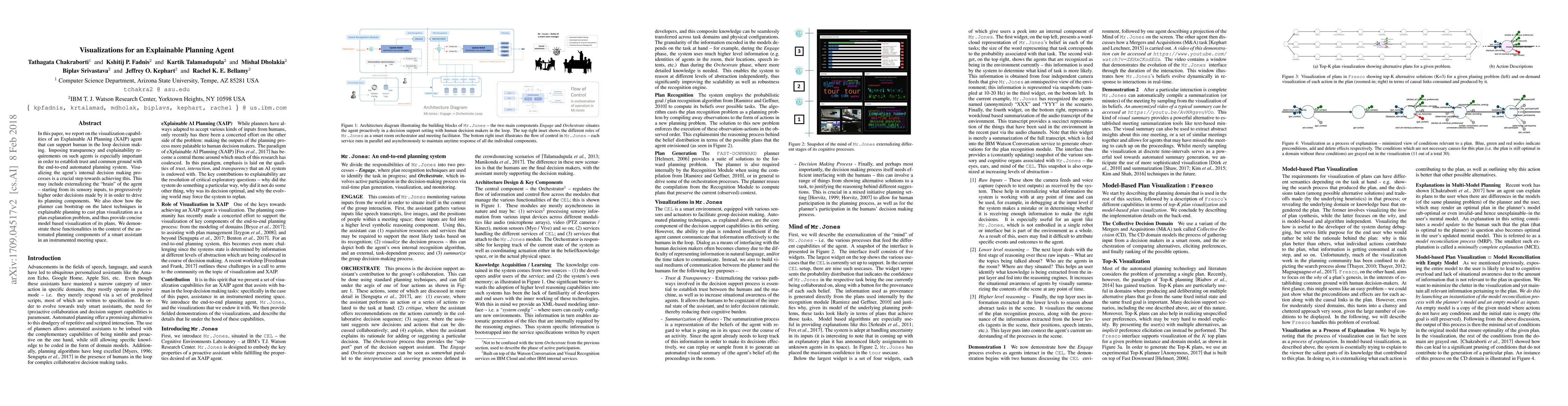 In this paper, we report on the visualization capabilities of an Explainable AI Planning (XAIP) agent that can support human in the loop decision making. Imposing transparency and explainability requirements on such agents is especially important in order to establish trust and common ground with the end-to-end automated planning system. Visualizing the agent's internal decision-making processes is a crucial step towards achieving this. This may include externalizing the "brain" of the agent -- starting from its sensory inputs, to progressively higher order decisions made by it in order to drive its planning components. We also show how the planner can bootstrap on the latest techniques in explainable planning to cast plan visualization as a plan explanation problem, and thus provide concise model-based visualization of its plans. We demonstrate these functionalities in the context of the automated planning components of a smart assistant in an instrumented meeting space.