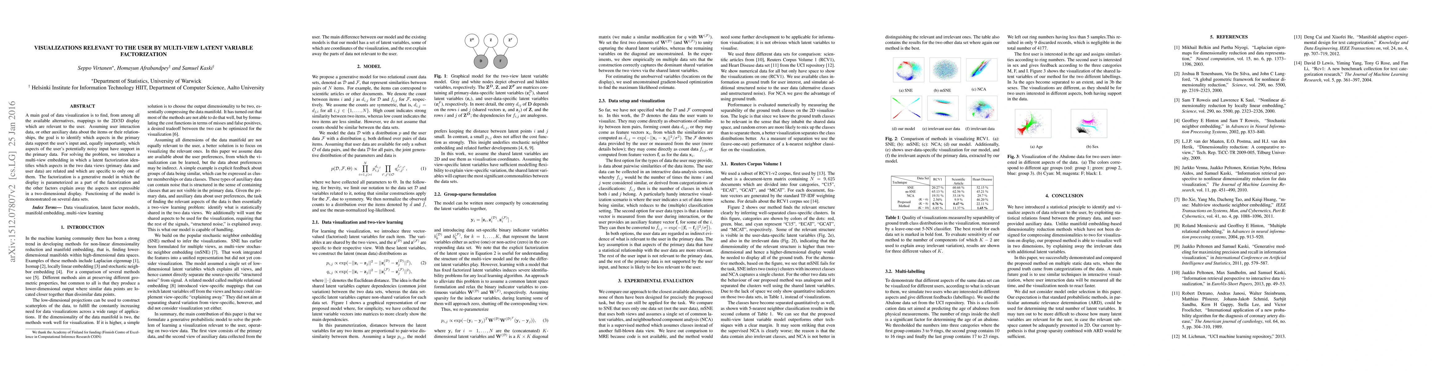 A main goal of data visualization is to find, from among all the available alternatives, mappings to the 2D/3D display which are relevant to the user. Assuming user interaction data, or other auxiliary data about the items or their relationships, the goal is to identify which aspects in the primary data support the user\'s input and, equally importantly, which aspects of the user\'s potentially noisy input have support in the primary data. For solving the problem, we introduce a multi-view embedding in which a latent factorization identifies which aspects in the two data views (primary data and user data) are related and which are specific to only one of them. The factorization is a generative model in which the display is parameterized as a part of the factorization and the other factors explain away the aspects not expressible in a two-dimensional display. Functioning of the model is demonstrated on several data sets.