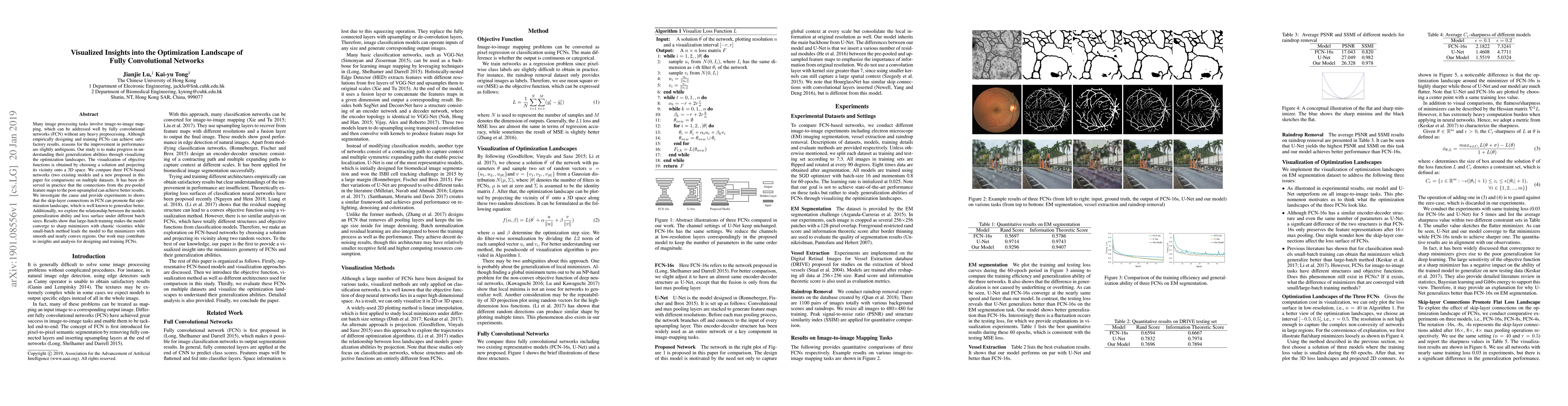 Many image processing tasks involve image-to-image mapping, which can be addressed well by fully convolutional networks (FCN) without any heavy preprocessing. Although empirically designing and training FCNs can achieve satisfactory results, reasons for the improvement in performance are slightly ambiguous. Our study is to make progress in understanding their generalization abilities through visualizing the optimization landscapes. The visualization of objective functions is obtained by choosing a solution and projecting its vicinity onto a 3D space. We compare three FCN-based networks (two existing models and a new proposed in this paper for comparison) on multiple datasets. It has been observed in practice that the connections from the pre-pooled feature maps to the post-upsampled can achieve better results. We investigate the cause and provide experiments to shows that the skip-layer connections in FCN can promote flat optimization landscape, which is well known to generalize better. Additionally, we explore the relationship between the models generalization ability and loss surface under different batch sizes. Results show that large-batch training makes the model converge to sharp minimizers with chaotic vicinities while small-batch method leads the model to flat minimizers with smooth and nearly convex regions. Our work may contribute to insights and analysis for designing and training FCNs.