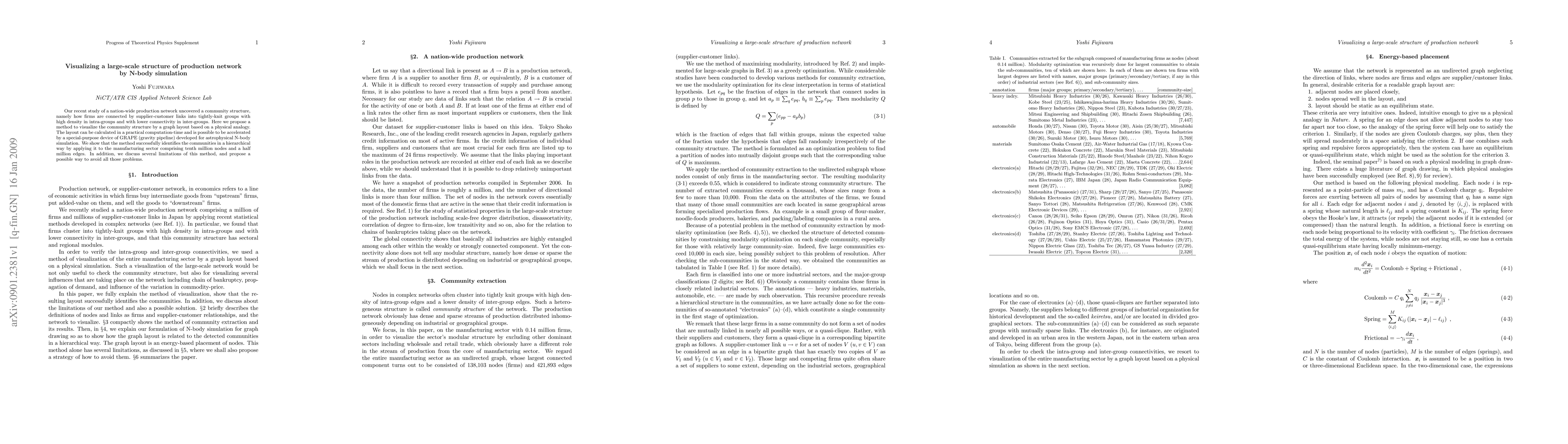 Our recent study of a nation-wide production network uncovered a community structure, namely how firms are connected by supplier-customer links into tightly-knit groups with high density in intra-groups and with lower connectivity in inter-groups. Here we propose a method to visualize the community structure by a graph layout based on a physical analogy. The layout can be calculated in a practical computation-time and is possible to be accelerated by a special-purpose device of GRAPE (gravity pipeline) developed for astrophysical N-body simulation. We show that the method successfully identifies the communities in a hierarchical way by applying it to the manufacturing sector comprising tenth million nodes and a half million edges. In addition, we discuss several limitations of this method, and propose a possible way to avoid all those problems.