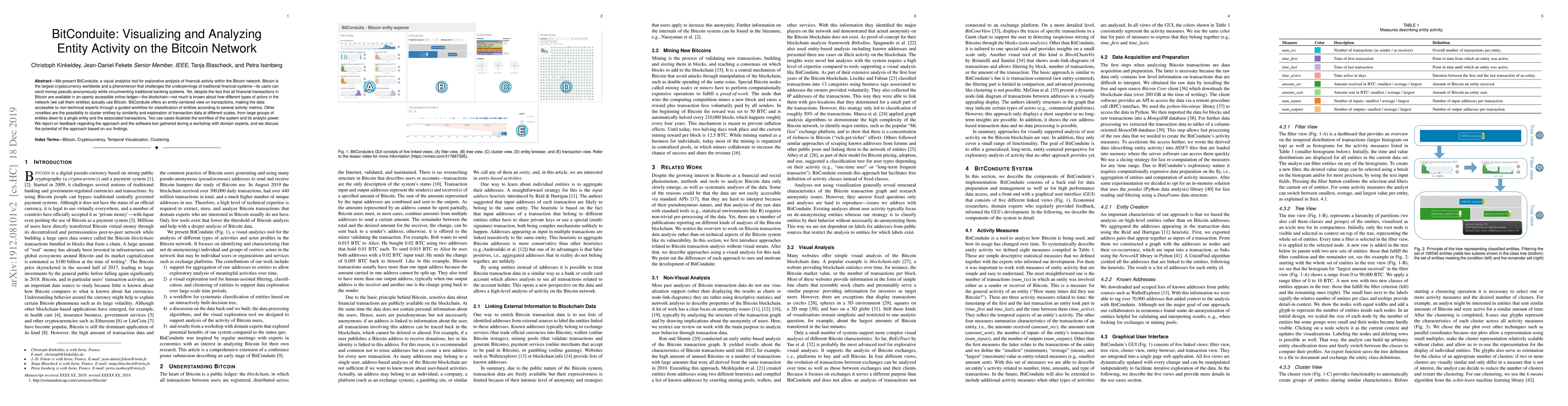 BitConduite is a visual analytics tool designed for exploring Bitcoin network activity, offering insights into how different entities use the cryptocurrency. It facilitates classification and clustering of entities based on transaction metrics, enabling detailed analysis from broad groups to individual transactions.