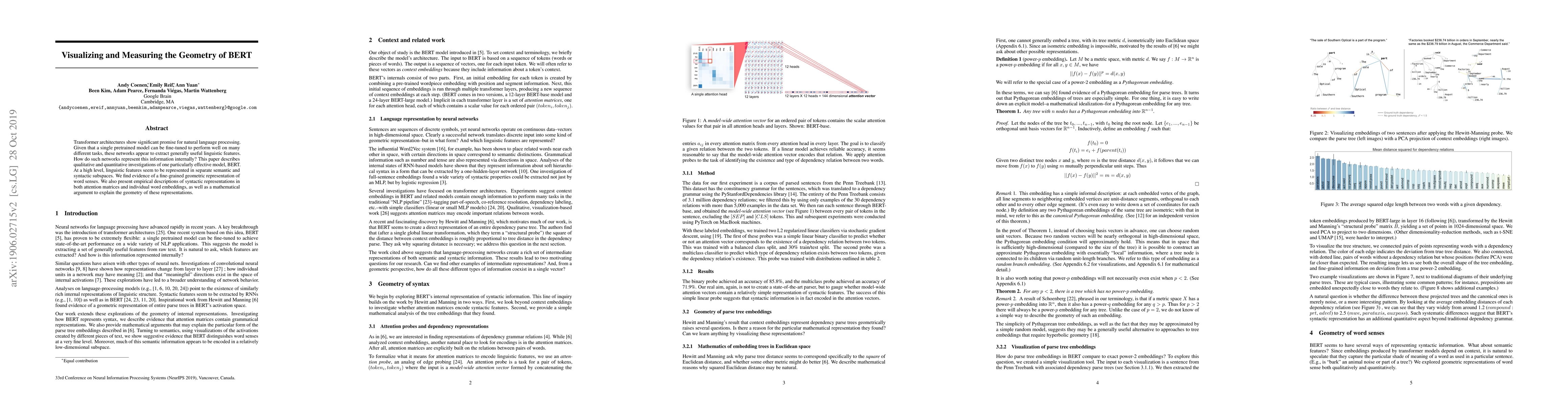 Transformer architectures show significant promise for natural language processing. Given that a single pretrained model can be fine-tuned to perform well on many different tasks, these networks appear to extract generally useful linguistic features. A natural question is how such networks represent this information internally. This paper describes qualitative and quantitative investigations of one particularly effective model, BERT. At a high level, linguistic features seem to be represented in separate semantic and syntactic subspaces. We find evidence of a fine-grained geometric representation of word senses. We also present empirical descriptions of syntactic representations in both attention matrices and individual word embeddings, as well as a mathematical argument to explain the geometry of these representations.