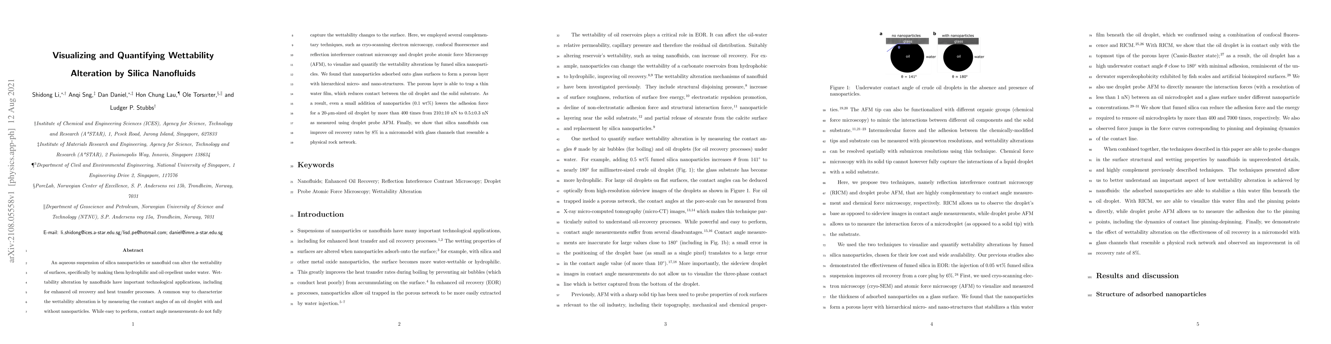 This study uses advanced microscopy techniques to visualize and quantify how silica nanofluids alter surface wettability, forming porous layers that trap water and reduce oil droplet adhesion, enhancing oil recovery by 8% in simulated rock networks. Nanoparticle-induced wettability changes are more fully characterized beyond traditional contact angle measurements.