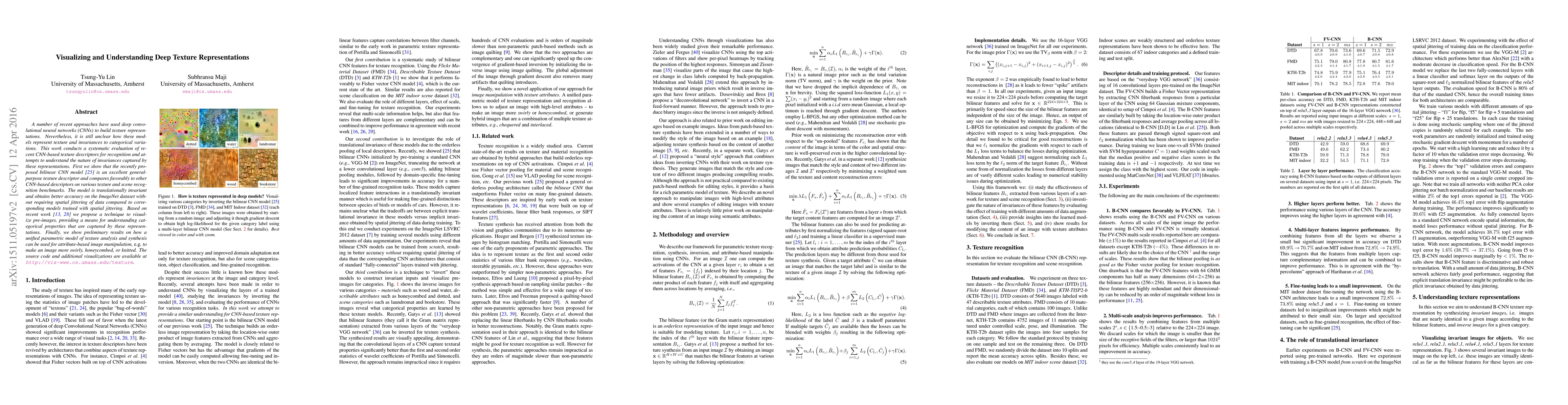 A number of recent approaches have used deep convolutional neural networks (CNNs) to build texture representations. Nevertheless, it is still unclear how these models represent texture and invariances to categorical variations. This work conducts a systematic evaluation of recent CNN-based texture descriptors for recognition and attempts to understand the nature of invariances captured by these representations. First we show that the recently proposed bilinear CNN model [25] is an excellent general-purpose texture descriptor and compares favorably to other CNN-based descriptors on various texture and scene recognition benchmarks. The model is translationally invariant and obtains better accuracy on the ImageNet dataset without requiring spatial jittering of data compared to corresponding models trained with spatial jittering. Based on recent work [13, 28] we propose a technique to visualize pre-images, providing a means for understanding categorical properties that are captured by these representations. Finally, we show preliminary results on how a unified parametric model of texture analysis and synthesis can be used for attribute-based image manipulation, e.g. to make an image more swirly, honeycombed, or knitted. The source code and additional visualizations are available at http://vis-www.cs.umass.edu/texture
